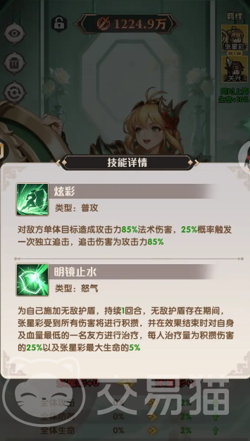 张星彩是前期易获取且泛用性强的法系角色。普攻“炫彩”对单体造成85%攻击力法术伤害,并有25%概率触发独立追击(伤害同为85%攻击力),具备一定连击潜力。怒气技“明镜止水”为其自身施加无敌护盾,期间所受全部伤害将被积攒,护盾结束时,将积攒伤害的25%与张星彩最大生命的5%分别治疗自身及血量最低的一名友方单位,兼具生存保障与团队续航能力。