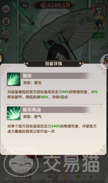 黄月英普攻可对敌方血量最低单位造成90%攻击力的物理伤害,并有30%概率施加破甲效果,降低目标100%的防御数值。怒气技能“璇玑再动”对单体造成240%攻击力物理伤害,并令我方战力最高的武将立即再行动一次,大幅提升队伍节奏掌控力与输出密度,在多核阵容中价值突出。
