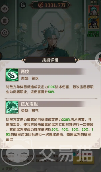 诸葛亮与黄月英协同作战效果显著。“两仪”普攻对单体造成110%攻击力法术伤害,若目标为肉盾职业,则伤害提升50%;怒气技“苍龙濯世”锁定敌方攻击力最高单位,造成330%攻击力法术伤害,并施加军令:使我方攻击最高武将立刻普攻该目标,其余武将按战力从高到低依次以50%、40%、30%、20%、10%概率追击,形成高频连击链,在蜀国体系内尤为高效。