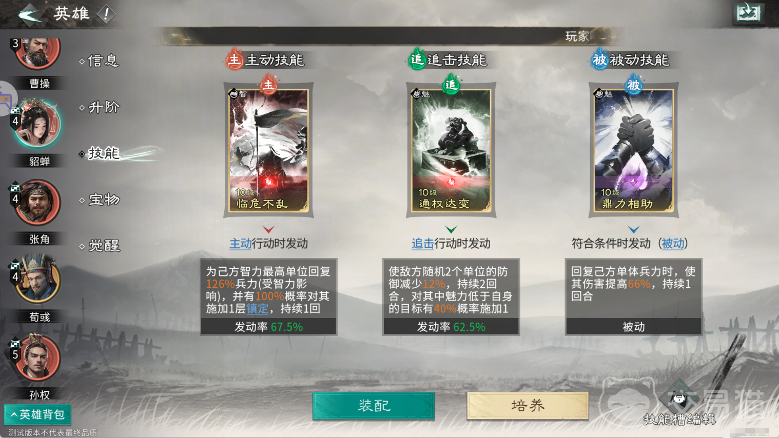 貂蝉主动技推荐“临危”,可为己方智力最高者恢复兵力并附加镇定效果,规避控制干扰,同时借助荀彧“王佐之才”带来的15点智力提升,进一步放大张角的法术输出;追击技选用“通权达变”,随机降低两名敌方单位12%防御,并有一定概率施加睡眠状态;被动技建议选择“鼎力相助”,与“临危”形成联动,在张角兵力恢复过程中同步赋予增伤效果,实现伤害与续航的双重强化。