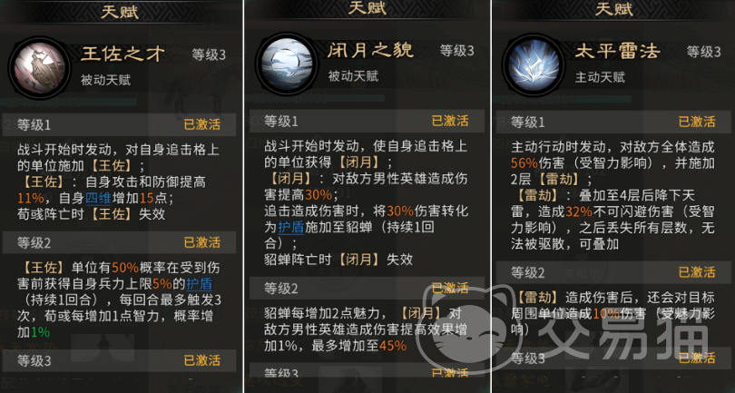 在天赋搭配上,荀彧携带“王佐之才”,可为张角稳定叠加“王佐”状态,提供11%攻击与防御加成,并额外提升四维属性各15点;貂蝉启用“闭月”天赋,使张角对男性目标伤害提高30%,升至3级后还可增加张角自身追击触发频率,配合其核心天赋“太平雷法”,实现稳定高效的全体雷暴输出。