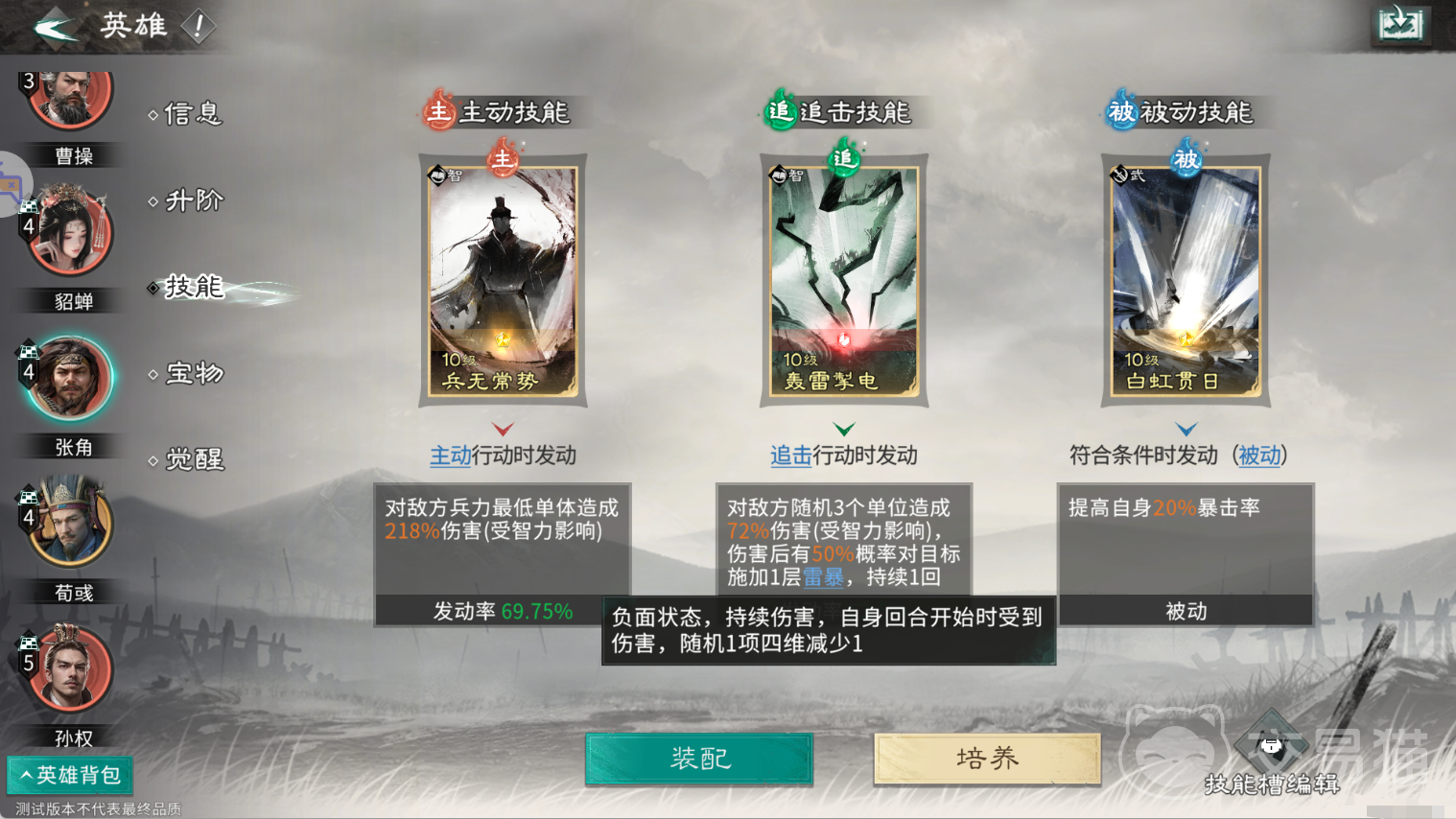 技能配置方面,张角主动技首选“兵无常势”,弥补其群攻技能对残血单位清场效率不足的问题,确保稳定收割;追击技选用“轰雷”,可高频响应貂蝉“闭月”提供的追击增频效果,加速雷暴层数叠加;被动技推荐“白·红贯日”,直接提升20%暴击率,显著增强单次雷击的爆发上限。