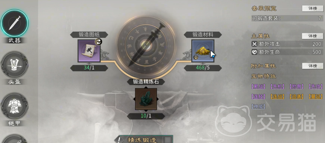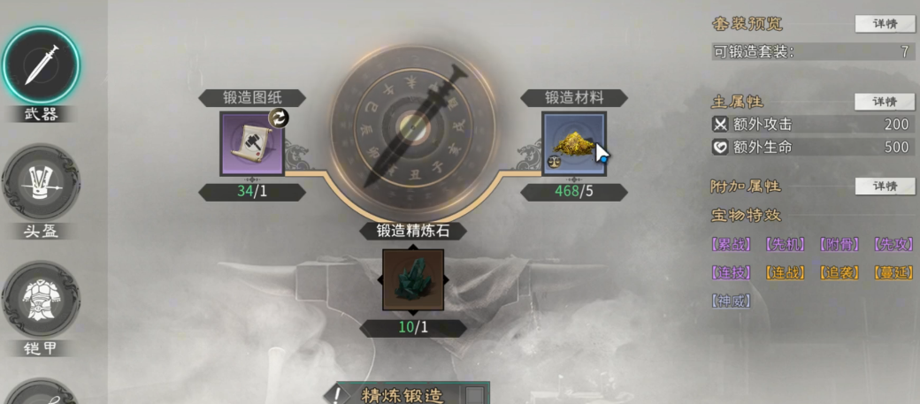 武器获取主要通过锻造系统实现,分为普通锻造与精炼锻造两种模式。普通锻造需消耗对应图纸、基础材料及银币;精炼锻造则额外要求精炼石。图纸品质直接影响产出结果——使用普通图纸有概率激活稀有套装词条,而指定武器(如龙泉宝剑)必须匹配专属图纸方可精准合成。该武器不绑定特定武将,获取门槛较低,常被用于后期专属武器升星时的材料转化,即俗称的“狗粮型装备”。