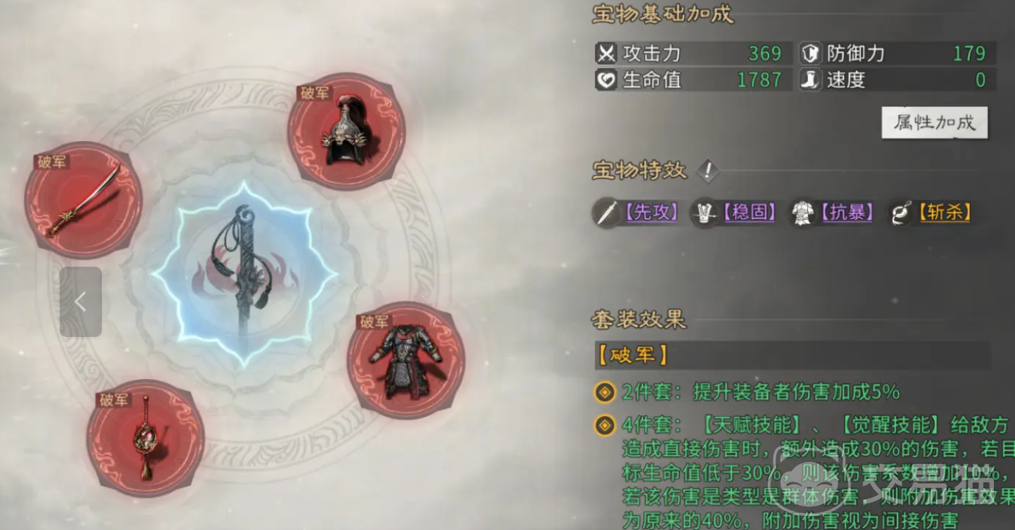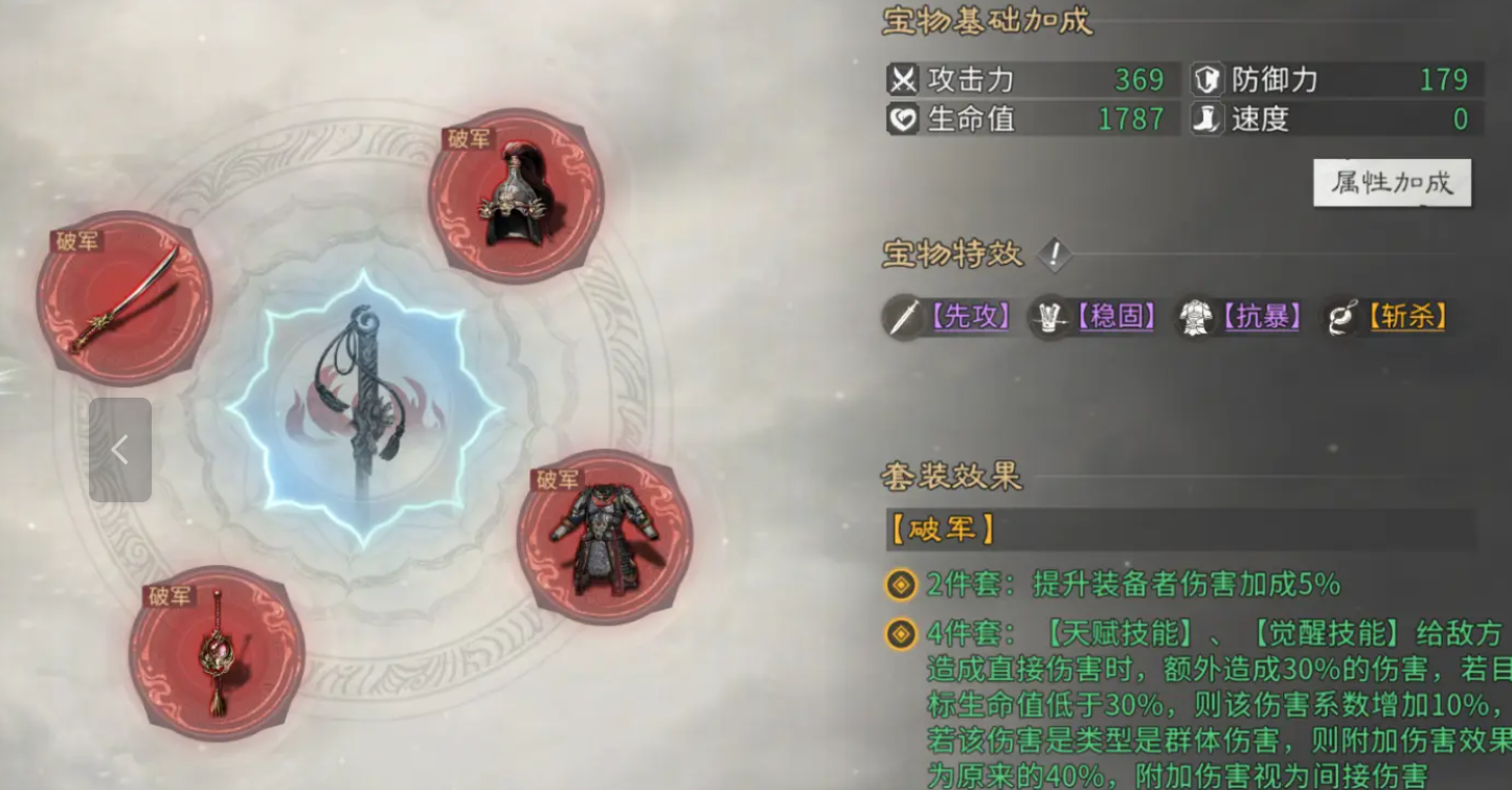 游戏前期资源有限,建议优先装配可获取的高基础属性武器;进入中后期后,应转向精细化配置。此时需结合武将定位选择套装:以高爆发物理输出见长的角色(如吕布、张辽、孙尚香)推荐穿戴破军套;侧重持续压制与连击节奏的武将(如吕布、关羽)则更适配战意套。当同系列套装集齐2件或4件时,将自动激活专属套系天赋,进一步强化角色特性。