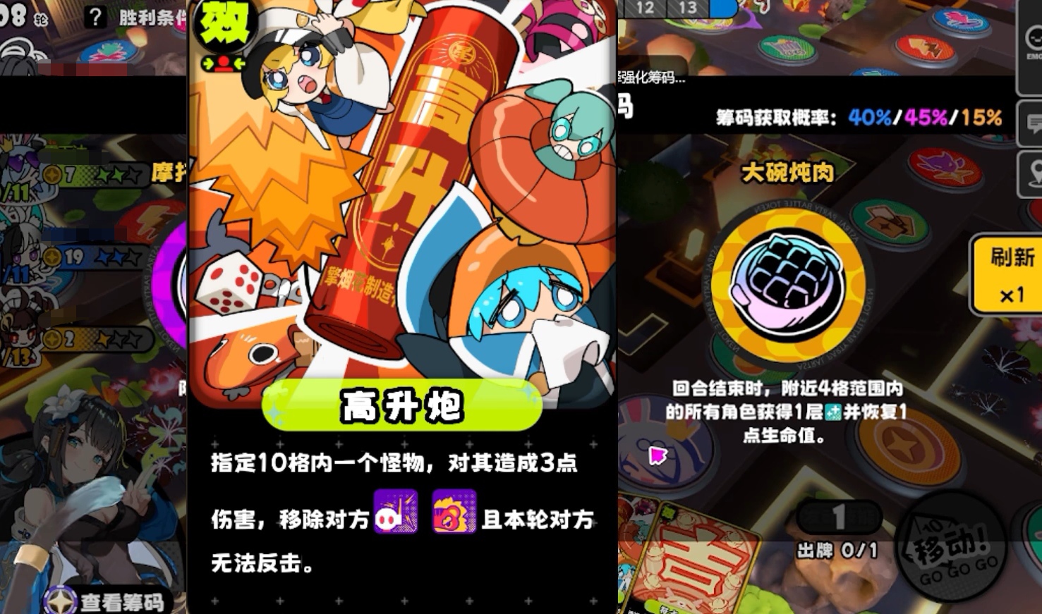除BOSS外,地图中还存在两种常规怪物:氛围机器人与爆竹呱呱。氛围机器人每回合自动释放【炒热气氛】,对周围4格内所有敌方单位同步提升1点攻击力与1点防御力,该增益不可驱散且持续生效,拖延清理将显著抬高后期战斗难度。爆竹呱呱不具备反击能力,碰撞玩家时不触发受击反馈,但每回合会锁定范围内血量最高的友方角色,以其基础攻击力造成真实伤害;被消灭后必掉落关键道具【高升炮】——此卡可指定10格内任意敌方单位,造成3点固定伤害并清除其全部增益状态,是贯穿整场战斗的核心输出手段。