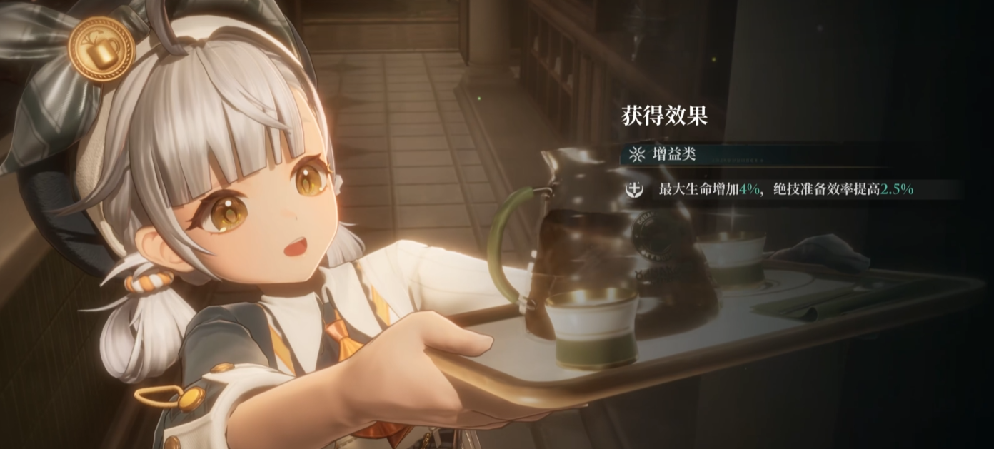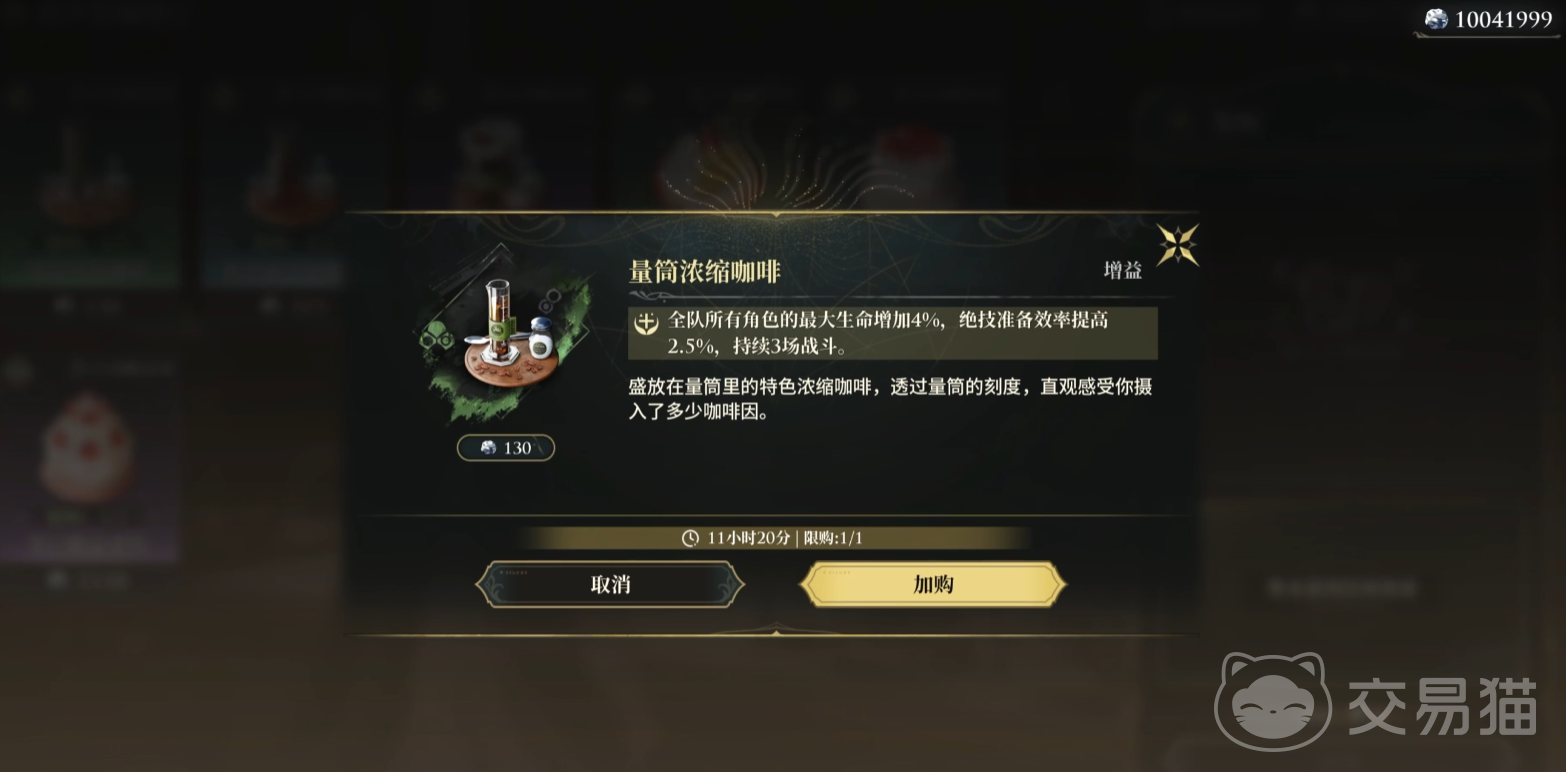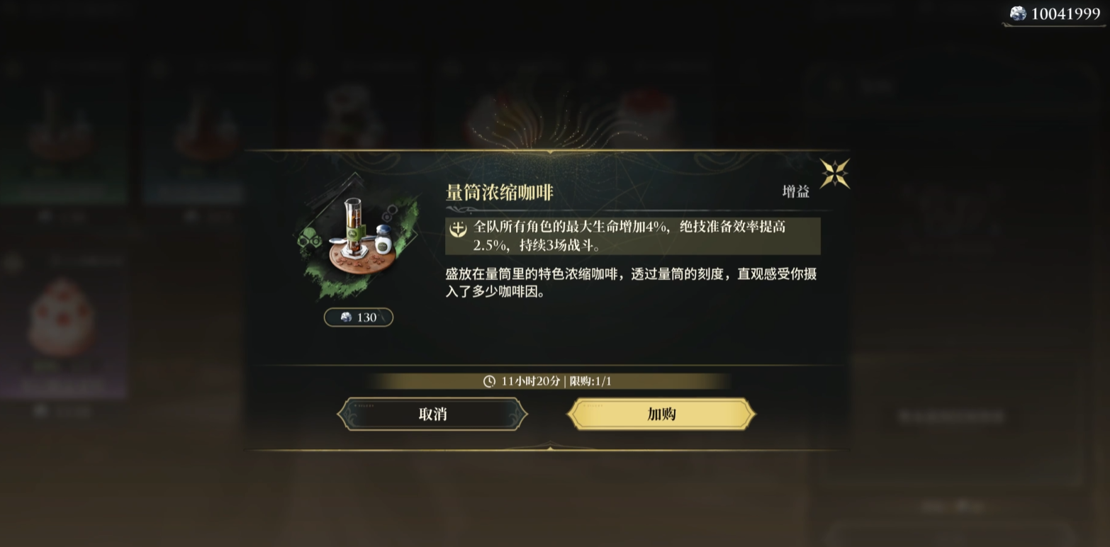 店内商品以银子为结算货币,涵盖多款功能型浓缩咖啡及配套甜品。其中量筒浓缩咖啡具有明确数值化效果:饮用后可使全体队友最大生命值提升4%,同时提高大招启动效率。所有增益均需完成结算动作方可生效,未结算前仅存于购物车中。