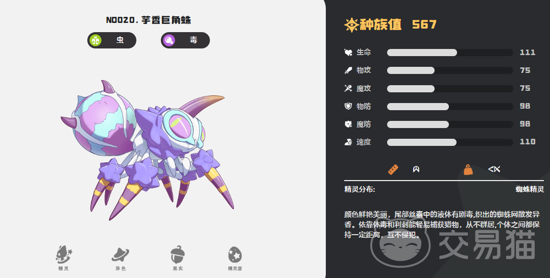 芋香巨角蛛负责毒素体系构建:当敌方使用低能耗技能时,将使其陷入中毒状态。技能搭配以毒攻毒为核心,可在敌方中毒期间持续提升自身攻击力;毒液渗透用于叠加中毒层数并附加魔法伤害;防御技能维持生存下限;扬沙则提供额外物理打击手段,整体输出维度丰富。