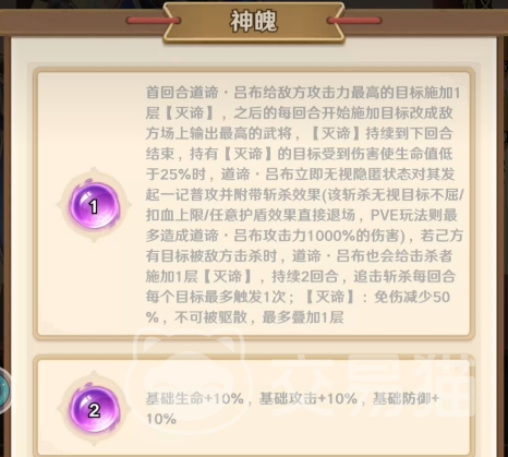 神魄系统构成战力跃迁核心:魂1自动锁定敌方输出最高单位施加【灭谛】,当其生命值低于25%时立即斩杀;若我方单位阵亡,击杀者亦将被附加该效果,实现被动反制;魂3升级【不屈】为复合生存技——触发时恢复生命、清除全部异常状态,并进入【涅槃】状态:免疫控制、怒气回复速度×2、反击概率提升、且每2点怒气额外提升普攻伤害,整体战力呈质变式增长。
