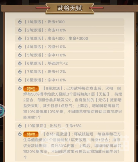 天赋成长体系强调资源自循环与生存韧性:9星解锁反击机制,受击时自动发起高伤还击;名将1星激活强制回怒——每回合行动结束后,若自身怒气低于6点则补至满额,并在队友攻击或被攻击时额外获取怒气,上限提升至12点,确保技能释放稳定性;名将3星赋予【不屈】效果,濒死触发时暴击率、吸血率提升,且攻击必定命中,虽限单次生效,但具备决定战局走向的逆转潜力;神将1星引入真实伤害强化,释放技能时额外消耗1–4点怒气,转化为无视护盾的真实伤害,大幅提升破防效率。