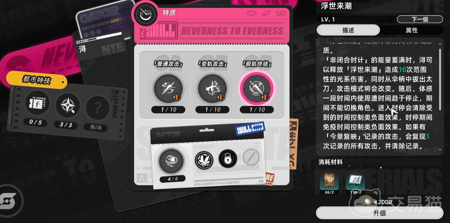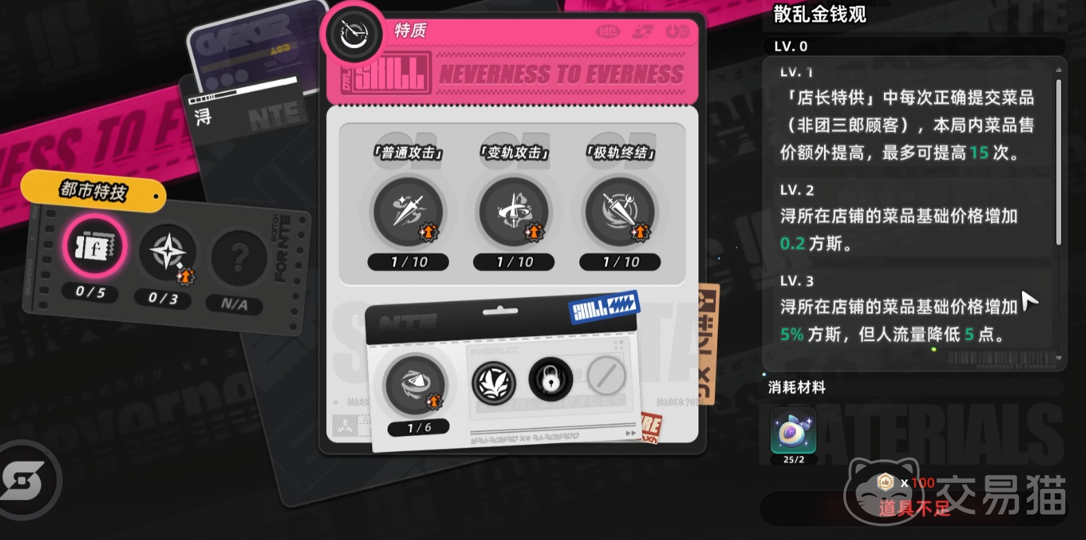 浔的基础机制围绕“经营”与“战斗”双线展开。其都市特技【散乱金钱观】可在每次成功提交菜品后提升单次售价,最高叠加15层;同时提升店铺基础菜价,虽伴随小幅人流量衰减,但整体收益呈显著正向增长。该特性使其在经济循环与战力养成环节均具备持续赋能能力。