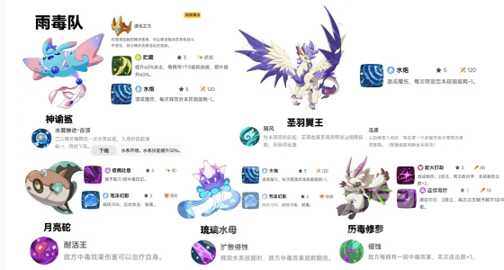 若需增强持续作战能力与战术容错,可延伸构建“雨毒队”。该变体在保留雨天体系基础上,融入中毒叠加机制:首领化精灵仍作为起手降雨源,首回合优先施加中毒印记;随后琉璃水母登场,利用雨天增益强化水系技能命中率与伤害,并触发中毒层数翻倍效果;圣羽翼王则凭借“迅捷”状态快速衔接多段输出,使中毒伤害与水系爆发同步生效。此组合既享有雨天50%水系威力加成,又叠加多层中毒持续扣血,在面对高防御、高回复型肉盾阵容时展现出更强的压制韧性与资源消耗优势。