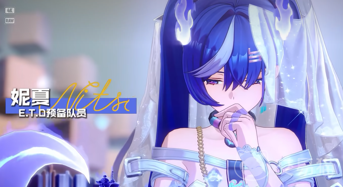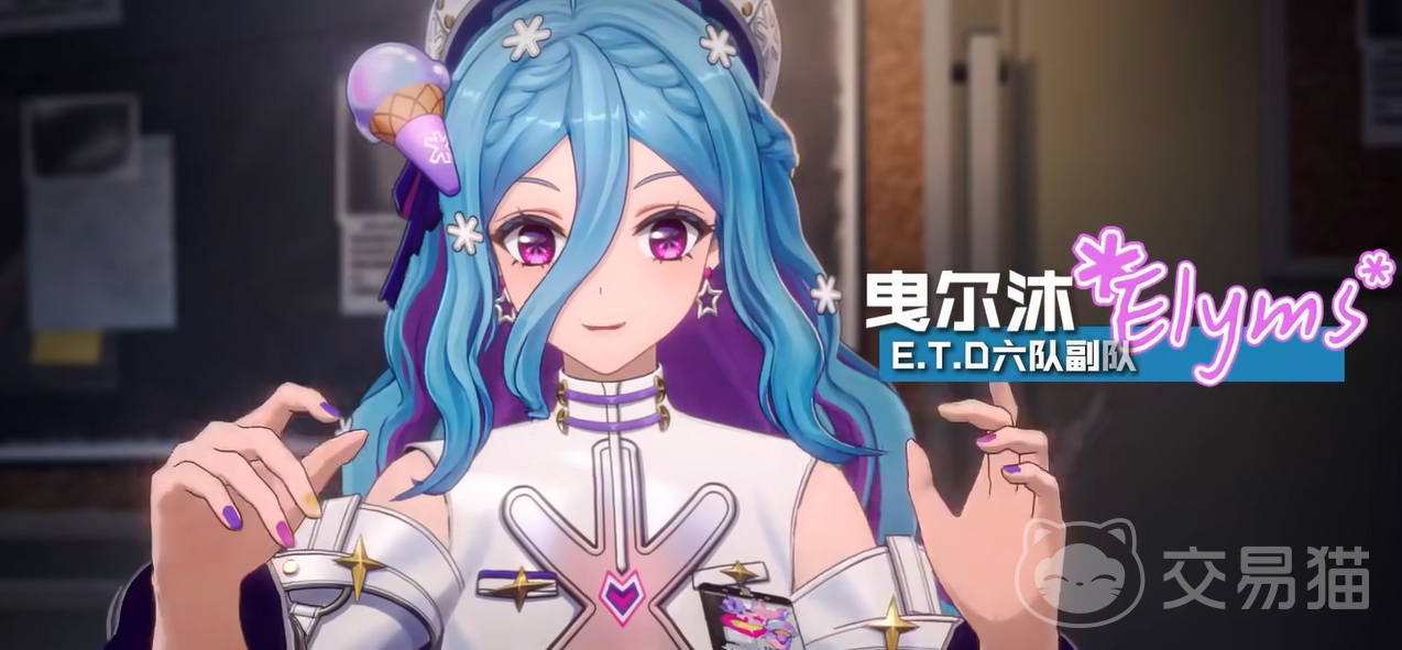 曳尔沐签名附带雪花纹理,整体冷调留白,与傻白甜人设形成趣味反差。全身多处雪花标记及冰淇淋道具强化其冰系辅助特质。PV结尾导演身份揭示其能力可能延伸至镜头操控维度,推测将提供范围减速、冻结或时空定格类控制技能,同时大概率承担城市探索中的视角拓展与环境互动功能。
