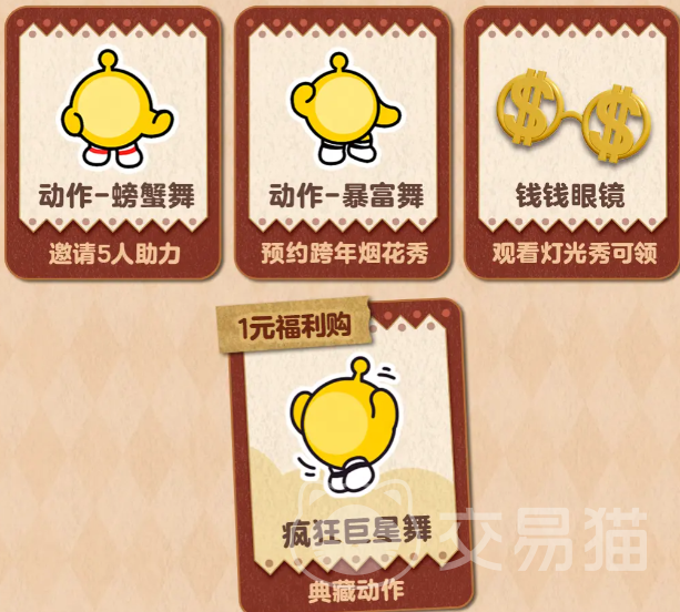 除基础奖励外,本次活动同步上线多款限定外观与动作道具。其中,“螃蟹舞”需成功邀请5位好友助力解锁;“暴富舞”为预约跨年烟花秀即可直接领取;“钱钱眼镜”装饰需完整观看灯光秀后发放;而“疯狂巨星舞”则以1元直购形式开放获取,确保所有玩家均可按需选择。