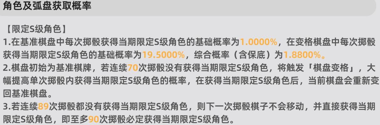 该机制摒弃常规转盘或纯随机模型,转而引入“掷骰行进+棋盘切换”结构。初始状态下,玩家处于基准棋盘,单次掷骰获取当期限定S角色的基础概率为1%;一旦触发“棋盘变格”,即进入高概率区域,单次获取概率跃升至19.5%。经数学测算,整体期望概率稳定在1.88%。