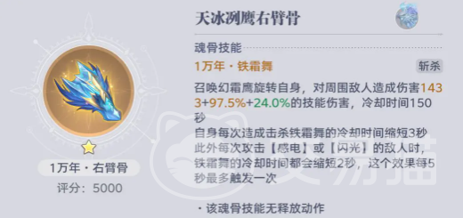 右腿骨推荐钢翼诡鹰,虽在单一感电场景中略逊于天冰冽鹰,但泛用性强、适配多套阵容体系,利于长期资源规划;右臂骨则必须选用天冰冽鹰,其核心机制在于对已感电目标缩短技能冷却且无施法前摇,大幅提升循环频率。仙草天赋加点应高度聚焦蓝电霸王龙,优先投入左侧魂技分支,确保四段魂技(含空中与地面各两次)完整释放链路顺畅;奥义技能并非主力输出来源,资源分配须避免倾斜过度。魂核搭配直接影响最终战力天花板,蓝电霸王龙建议采用2+2+2结构,即魔龙两件套+其他四件套组合,使属性加成收益达到最优区间。