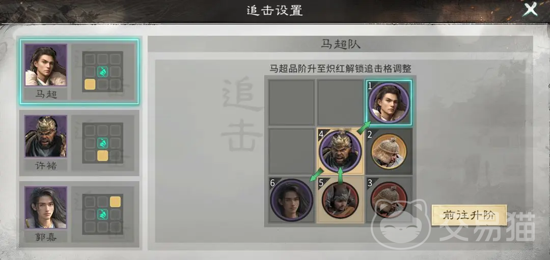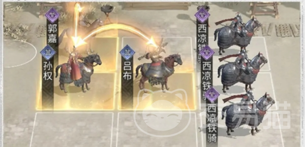 站位设计采用三角结构:孙权置于统帅位,确保属性增益最大化;郭嘉与吕布分列左右副将位。此布局虽使吕布失去追击格,但赋予孙权与郭嘉追击权限,显著提升技能衔接效率与战斗响应灵活性,契合四维比拼所需的高频互动节奏。