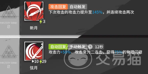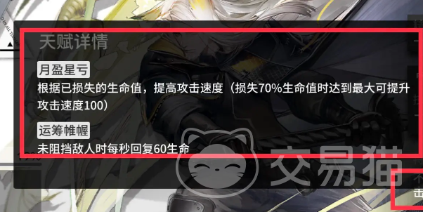 核心机制围绕双天赋展开:“月盈星亏”使攻击速度随当前生命比例下降而线性提升,当生命值降至30%时,攻速翻倍;“运筹帷幄”则赋予脱离战斗状态下的持续自然回血能力,叠加普攻附带的吸血效果,使其完全摆脱对医疗干员的依赖。单部署位承载双重生存与输出职能,资源利用率显著优于多数同阶近卫。该机制天然适配高压环境——唯有将血线精准压至30%区间,才能激活攻速、回血与输出效率的三重正向循环;若血量过高,则整体表现趋于平庸。