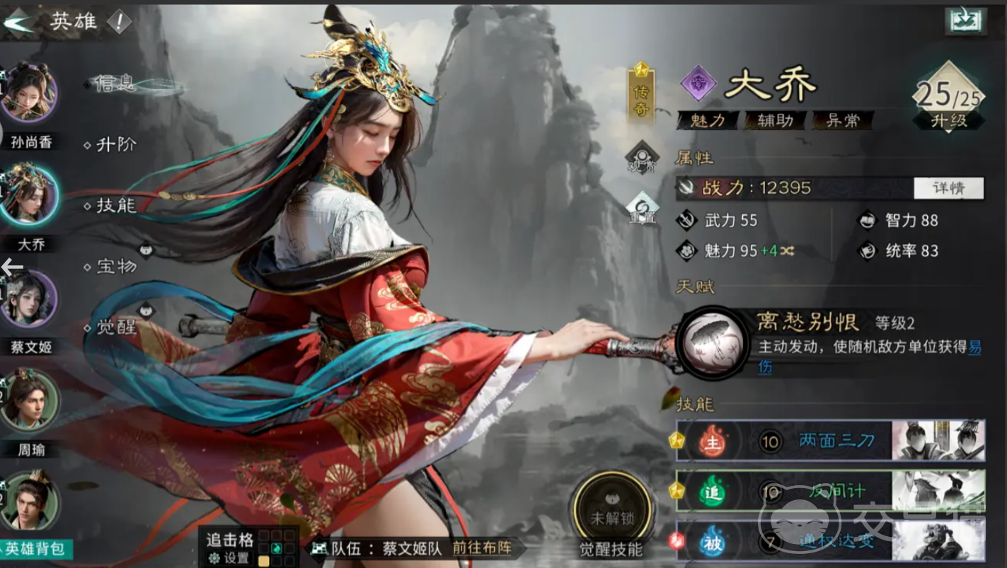 泛用型易伤辅助,低门槛高适配。天赋“离愁别恨”于主动行动时触发,随机为2名敌方单位施加5层“离愁”,每层提供4%易伤效果,持续2回合,最多叠加8层,受击即减1层。该效果可被绝大多数主力输出角色稳定触发,大幅提升对高防御或高兵力名将的穿透效率。同时具备基础治疗能力,使其在多种主流阵容中均可发挥战术价值,是新手过渡与中后期功能补强的优选配置。