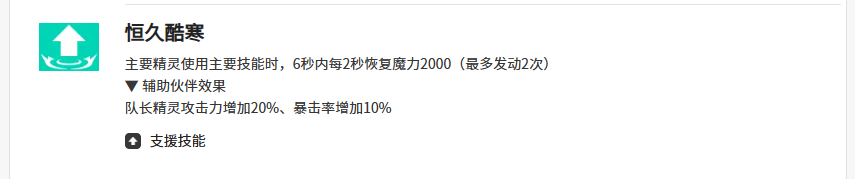 队长技「恒久酷寒」赋予全队战略续航能力:开启后6秒内恢复2000点魔力值,且支持连续两次释放(即最多恢复4000点)。当勒内白银担任队长时,全体队员获得20%攻击力加成与10%暴击率提升,显著强化整支队伍的输出效率与容错空间。