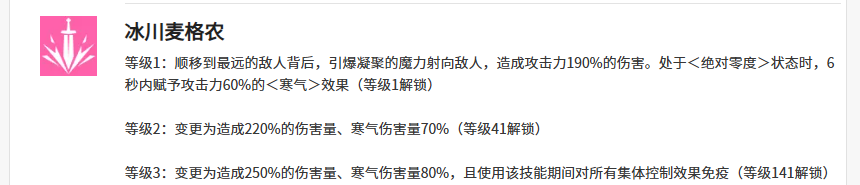 三技能「冰川麦格农」为单体高伤定位技,锁定距离最远的敌方单位进行突袭打击,基础伤害为190%攻击力。当角色处于「绝对零度」状态时,额外获得60%攻击力的寒气加成,总伤害提升至250%。该强化形态需角色达到141级方可完全激活,体现其深度养成价值。