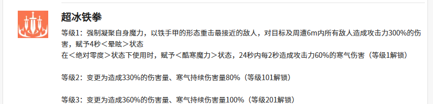 终极技「超冰铁拳」融合爆发与持续压制:凝聚魔力后以重击形式轰击前方,对6米内所有敌人造成300%攻击力伤害,并附带4秒眩晕。若在「绝对零度」状态下发动,还将额外激活「酷寒魔力」效果,在24秒内每2秒对周围敌人造成60%攻击力的寒气伤害,形成稳定的AOE压制链。