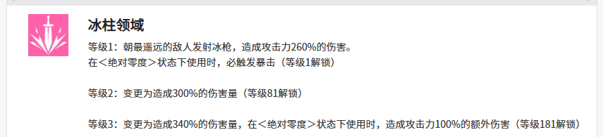 一技能「冰柱领域」为远程范围输出技,基础伤害为260%攻击力。当勒内白银处于「绝对零度」状态下释放,可显著提升暴击率,并在技能等级升至3级后解锁强化效果,进一步增强实战稳定性与爆发节奏。