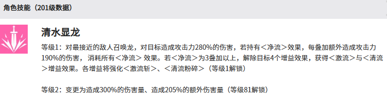 一技能【清水显龙】为召唤型输出技,基础造成280%攻击力伤害。当智河自身处于“净流”状态时,该技能可额外叠加190%伤害;若释放前已积攒≥3层“净流”,则在消耗全部层数后,可立即驱散目标身上4个增益效果,并为自身赋予1层“净流”及1层“激流”效果。两项增益将显著强化后续【激流斩】的伤害与功能表现。特别需注意:当“净流”层数达5层时,该技能触发的增益返还与伤害加成将进一步提升。