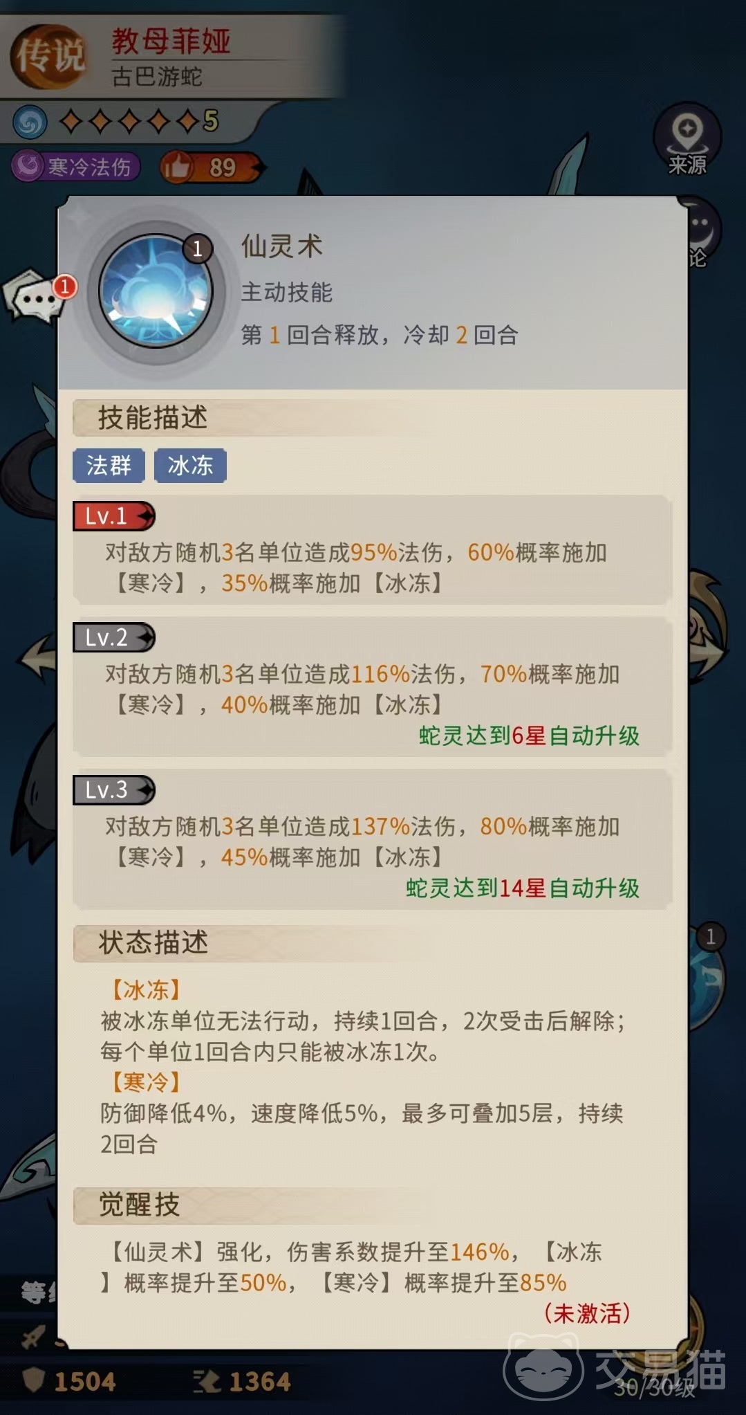 教母菲娅属于法师职业,主属性为寒冷系法术伤害。其一技能“仙灵术”可随机选取三名敌方单位施加法术伤害,并附带寒冷或冰冻状态概率。技能强化后,基础伤害系数提升,同时寒冷与冰冻触发率同步增强。寒冷效果可叠加至5层,每层降低目标防御与速度;冰冻则使其强制跳过一回合行动。由此可见,该技能的核心价值并非单纯输出,而在于持续削弱敌方作战节奏与行动能力。
