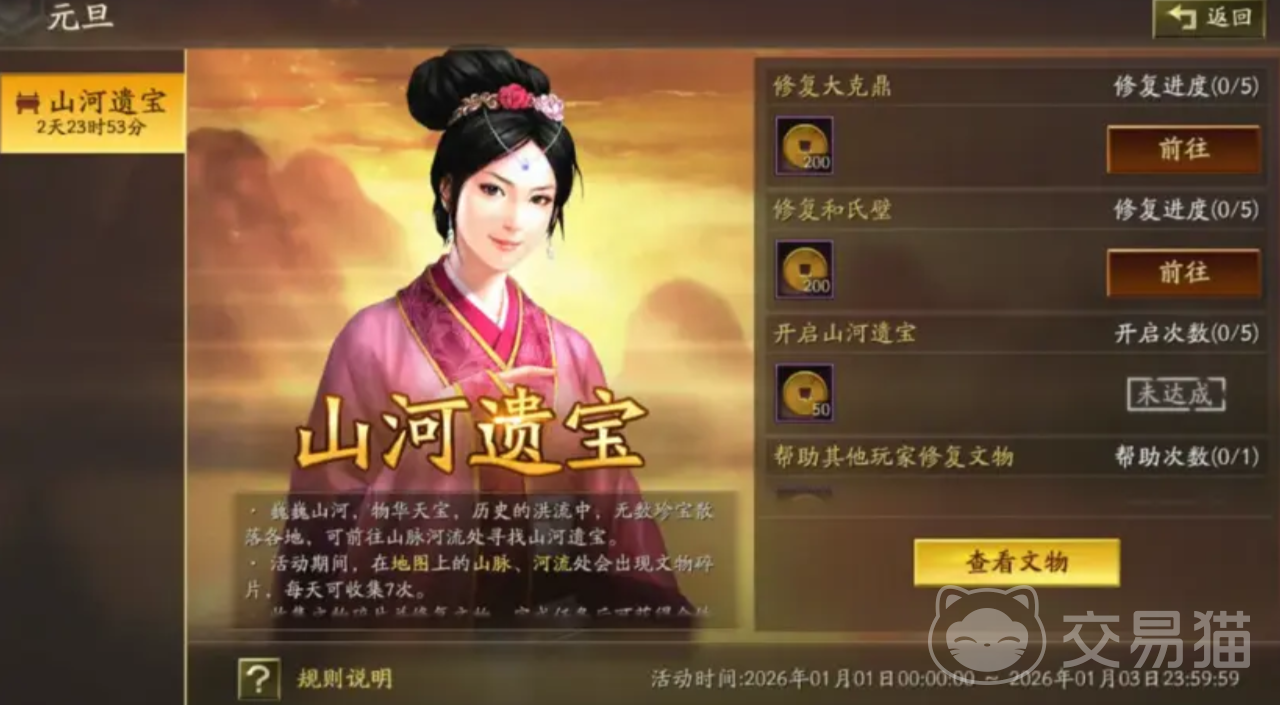“山河遗宝”活动将于2026年1月1日0时至1月3日24时限时开放。历史势力值达300及以上的玩家可直接参与。活动期间,每日0点系统将在全地图的山脉与河流区域随机刷新遗宝点位,玩家点击开启即可获得文物碎片。每位玩家每日最多开启7次遗宝,达到指定开启次数还可领取阶段奖励。
