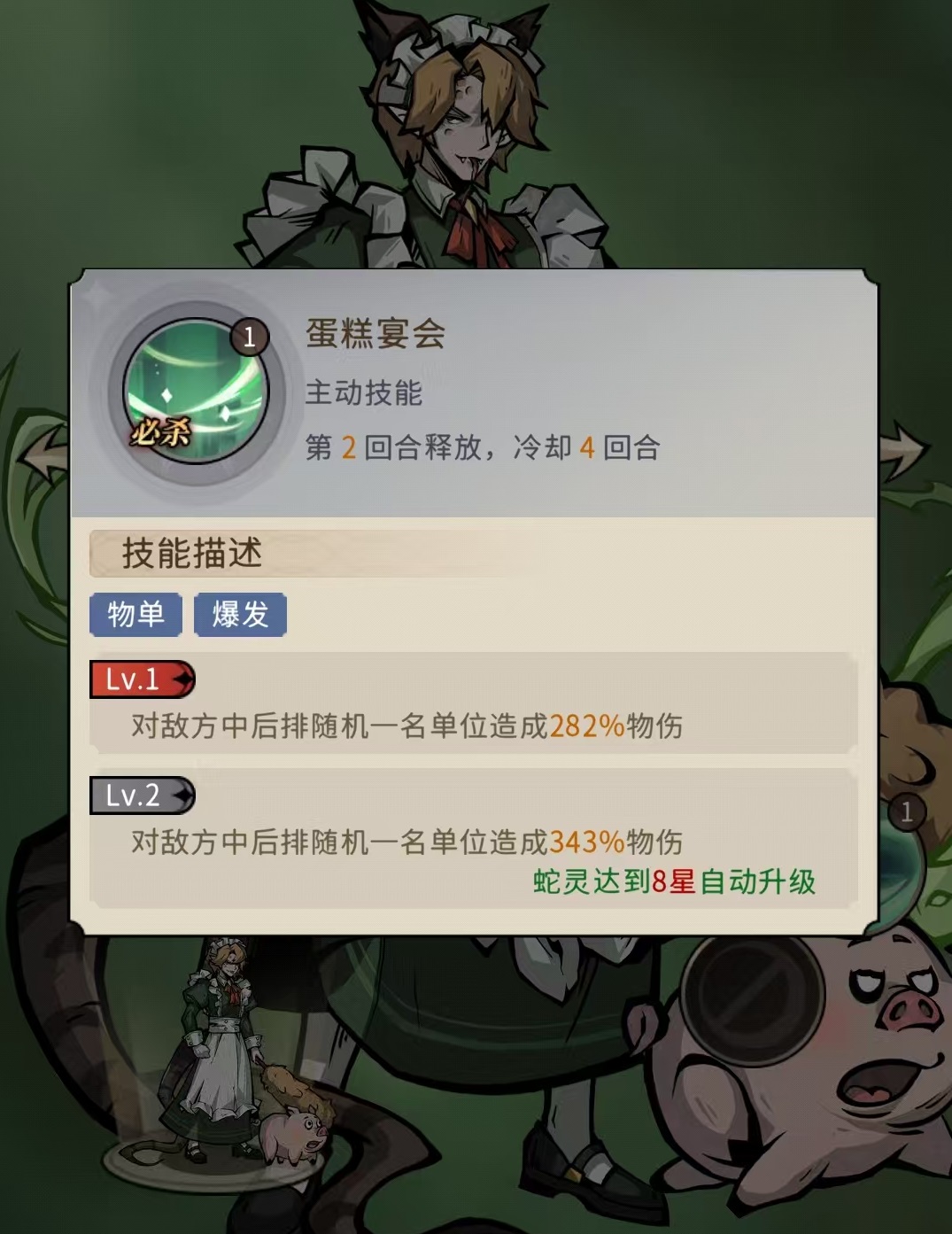 霍恩为史诗品质战士,核心定位为前中期单体高爆发输出。其普攻附带物理伤害,并对敌方后排单位生效;当攻击目标为战士职业或法师职业时,额外提升暴击率。必杀技“蛋糕宴会”可随机选定敌方中排或后排一名单位,施加高额物理伤害。受限于史诗稀有度,仅拥有一个被动技能:最高可提供20%攻击力加成与10%生命值加成。