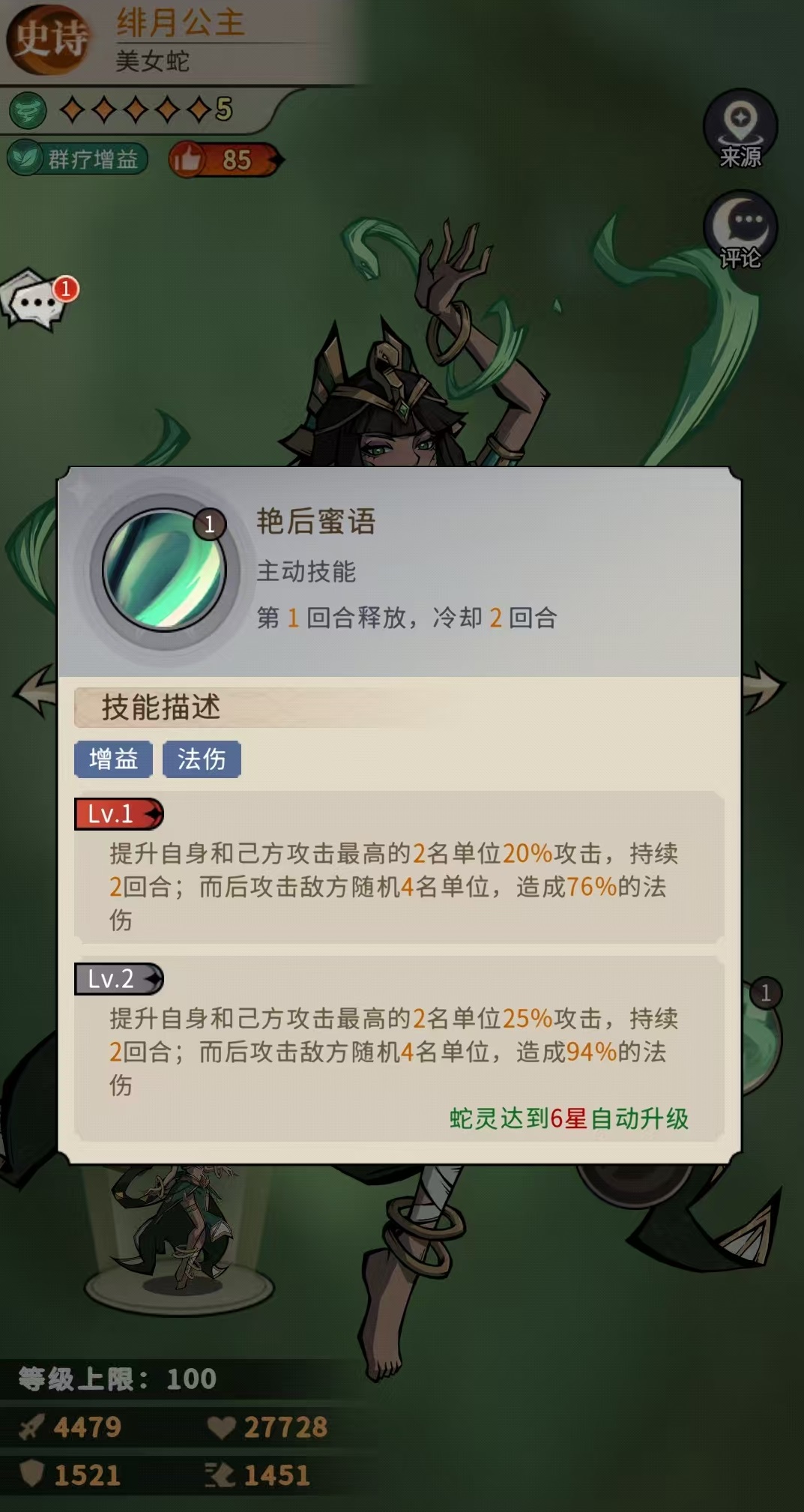 从基础设定来看,绯月公主为史诗品质角色,虽未达神话层级,但其辅助职能具有高度不可替代性。她不承担核心输出职责,而是专注于团队续航与战力强化:一技能可同时提升自身及我方攻击最高两名单位25%攻击力,持续两回合,并追加对四名随机敌方目标的伤害;二技能则定向治疗我方生命百分比最低的两名单位;被动效果可随等级逐步叠加,最高提供20%生命值与10%攻击力加成。