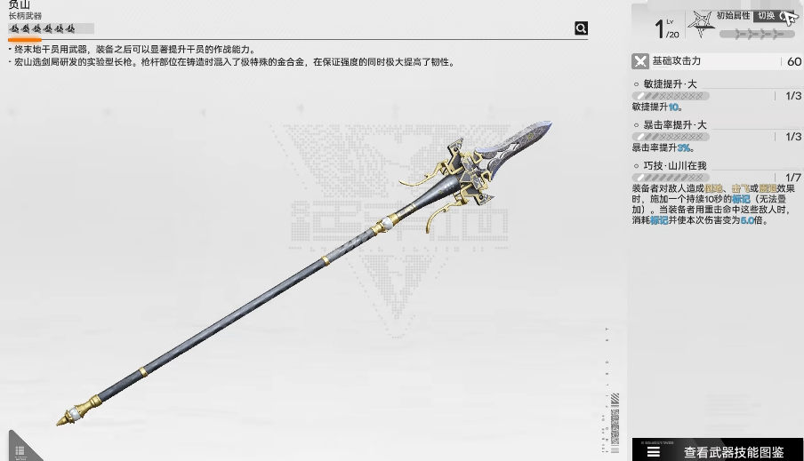 第五款「负山」侧重机动与暴击体系构建:提供10%敏捷与5%暴击率初始加成(随等级提升进一步扩大)。技能“山川在我”可在造成倒地或击飞效果时,为目标施加持续10秒的专属标记;当装备者以重击命中带标记目标时,可消耗标记层数,实现最高达5倍伤害的集中爆发。该机制深度契合高机动性、强控制衔接型六星干员的连招逻辑。