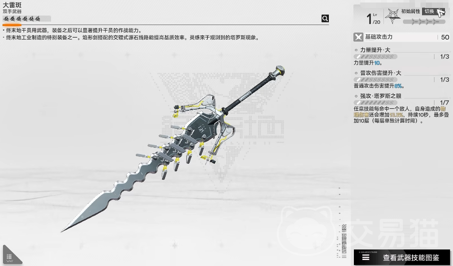 第二款推荐为「大雷斑」,同属双手武器类别,提供90%力量加成与69%普攻伤害提升。其主动技能“塔罗斯之言”可在每次普攻命中时触发,基于本次物理伤害额外提升60%物理伤害,持续10秒,最多叠加10层;各层独立计时,不共享持续时间,适合高频攻击型六星干员快速叠满增益,实现爆发式输出跃升。