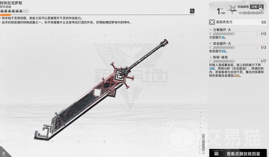 第三款为「阿布拉克萨斯」,初始力量+15%、攻击+8%,数值看似平实,但技能“粉碎破壳”具备强控场价值:命中敌人后降低其13%防御力,持续10秒;同时累计造成20%失衡值,适用于需高频触发失衡打断的战术场景。该武器特别适配控制系或破甲体系中的六星干员,在中后期面对高韧性敌人时表现突出。