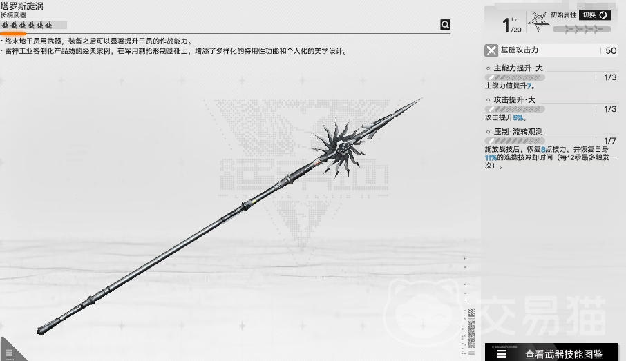 第四款「塔洛斯漩涡」为长柄类武器,基础攻击+7%,攻击速度+6%。其技能“压制流转观测”可在干员静止状态下每12秒恢复8点精力,并同步减少11%连接器类技能的冷却时间。该机制稀缺性强,是当前少数可直接优化关键技能循环节奏的武器,对依赖连接器协同作战的六星干员具有不可替代的战略价值。