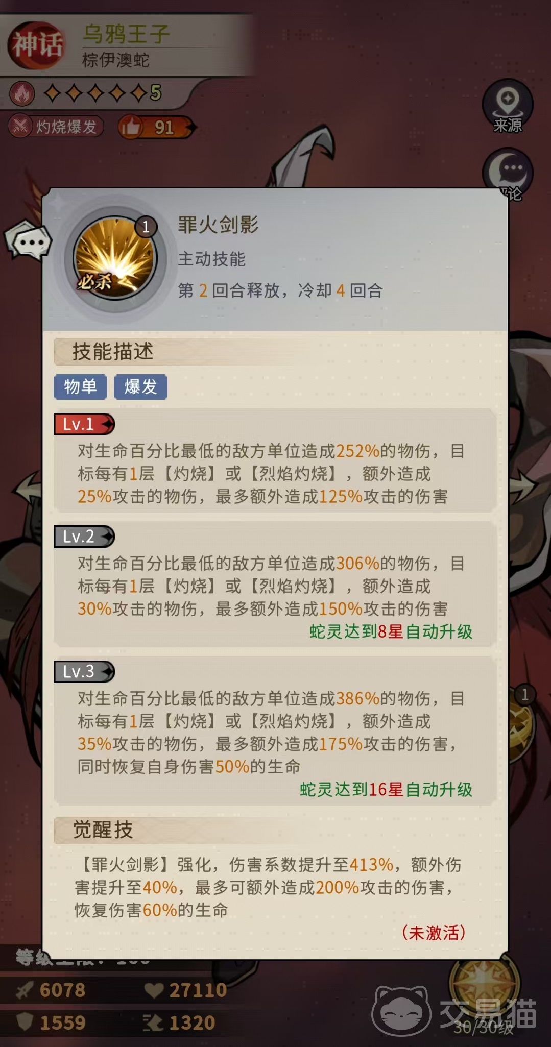 乌鸦王子的一技能具备前中排范围物理伤害能力,并附带灼烧概率判定。当敌方目标当前生命值低于50%时,该技能将额外提升暴击伤害。技能升级后,对已处于灼烧或烈焰灼烧状态的目标,以及半血以下单位,均触发额外伤害加成。被施加灼烧的目标每回合将损失相当于乌鸦王子15%攻击力的生命值,该效果最多可叠加5层。