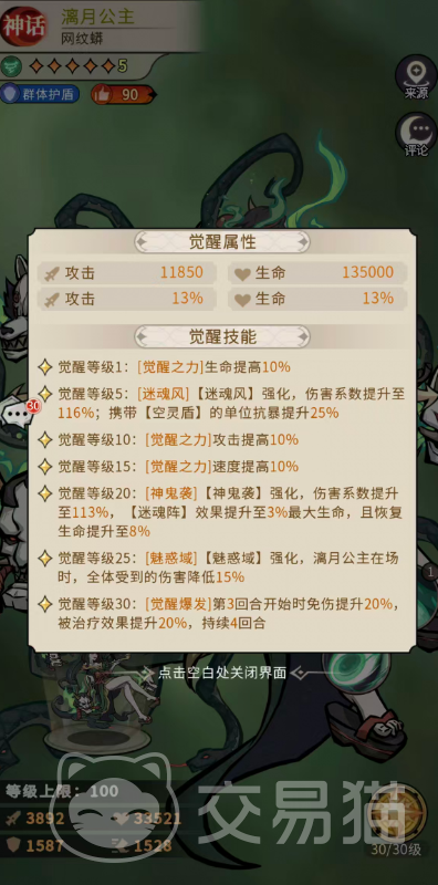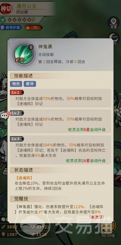 觉醒系统进一步拓展了漓月公主的成长路径:觉醒1级时,“觉醒之力”提供的生命数值提升10%;觉醒5级后,“迷魂风”自动进入强化状态,伤害系数达116%,空灵盾单位抗暴率同步提升至25%;觉醒10级与15级分别提升攻击与觉醒之力触发速度各10%;觉醒20级时,“神鬼袭”完成强化,伤害系数113%,迷魂阵额外生命损耗升至3%,治疗量增至8%;觉醒30级开启终极爆发,自第3回合起,漓月公主自身免伤提升20%,并额外获得20%治疗效果加成。