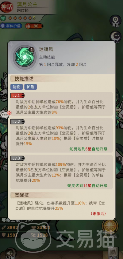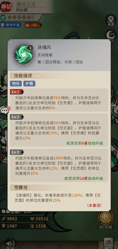 主动技能“迷魂风”具备双重功能:一方面对敌方中后排单位造成76%的物理伤害;另一方面自动为我方生命百分比最低的两名单位施加“空灵盾”,护盾值固定为漓月公主最大生命的8%。该效果具有显著的数值放大特性——当队伍中存在提升生命上限的角色时,空灵盾的实际承伤能力同步增强。在14星状态下,携带空灵盾的单位额外获得20%抗暴率加成;技能强化后,伤害系数提升至116%,此时抗暴率进一步增至25%。