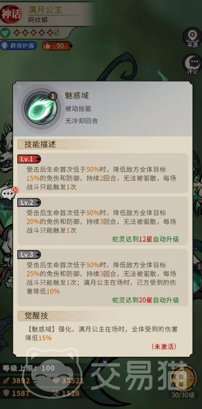 被动技能“网纹蟒体质”提供稳定增益,直接提升漓月公主20%生命与10%攻击力。“魅惑域”则为关键保命机制:当其生命首次跌破50%时触发,使敌方全体在接下来2回合内减免15%免伤与防御,该效果不可驱散,且每场战斗仅生效一次。升星后,只要漓月公主在场,全队所受伤害降低10%;该被动强化后,全队减伤幅度提升至15%。