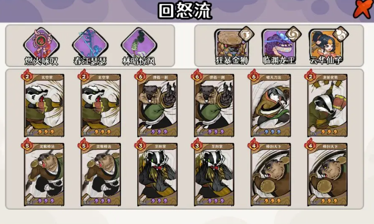 第二类为「回怒流」,侧重中后期怒气蓄积与爆发转化。该流派需一定发育周期,但容错率高、翻盘能力强,适用于偏好策略运营与资源管理的玩家。阵容由临渊龙王、云华仙子与狂暴金狮组成:临渊龙王作为终结核心,在怒气充足时可释放高额AOE或单体爆发技能;狂暴金狮专注怒气效率优化,其卡牌具备加速怒气消耗与技能铺垫功能;云华仙子则承担关键的卡牌回收与重置任务,确保高价值技能可重复启用。整套体系依赖稳定的怒气积累节奏,前期稳扎稳打,待时机成熟后集中释放多段高能技能组合。