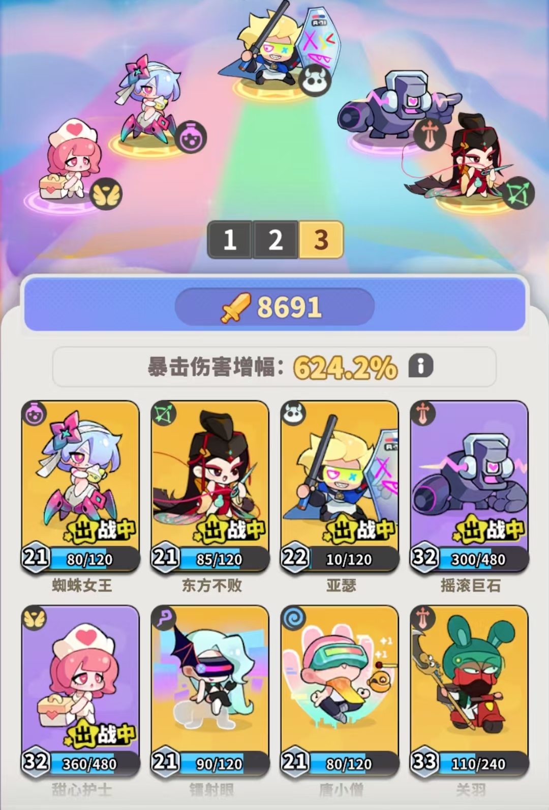 此阵容采用分阶段资源倾斜策略。前期优先强化东方不败,利用其快速清杂能力保障生存与节奏;中后期转向集中培养蜘蛛女王,通过叠加“蛛巢数量”“小蜘蛛攻击力”等递增型词条,使其召唤物逐步接管主力输出。配合亚瑟的坦度、摇滚巨石的群体嘲讽与甜心护士的续航,阵容在中后期拥有极强的滚雪球能力,尤其适合需要持久作战的长线关卡。