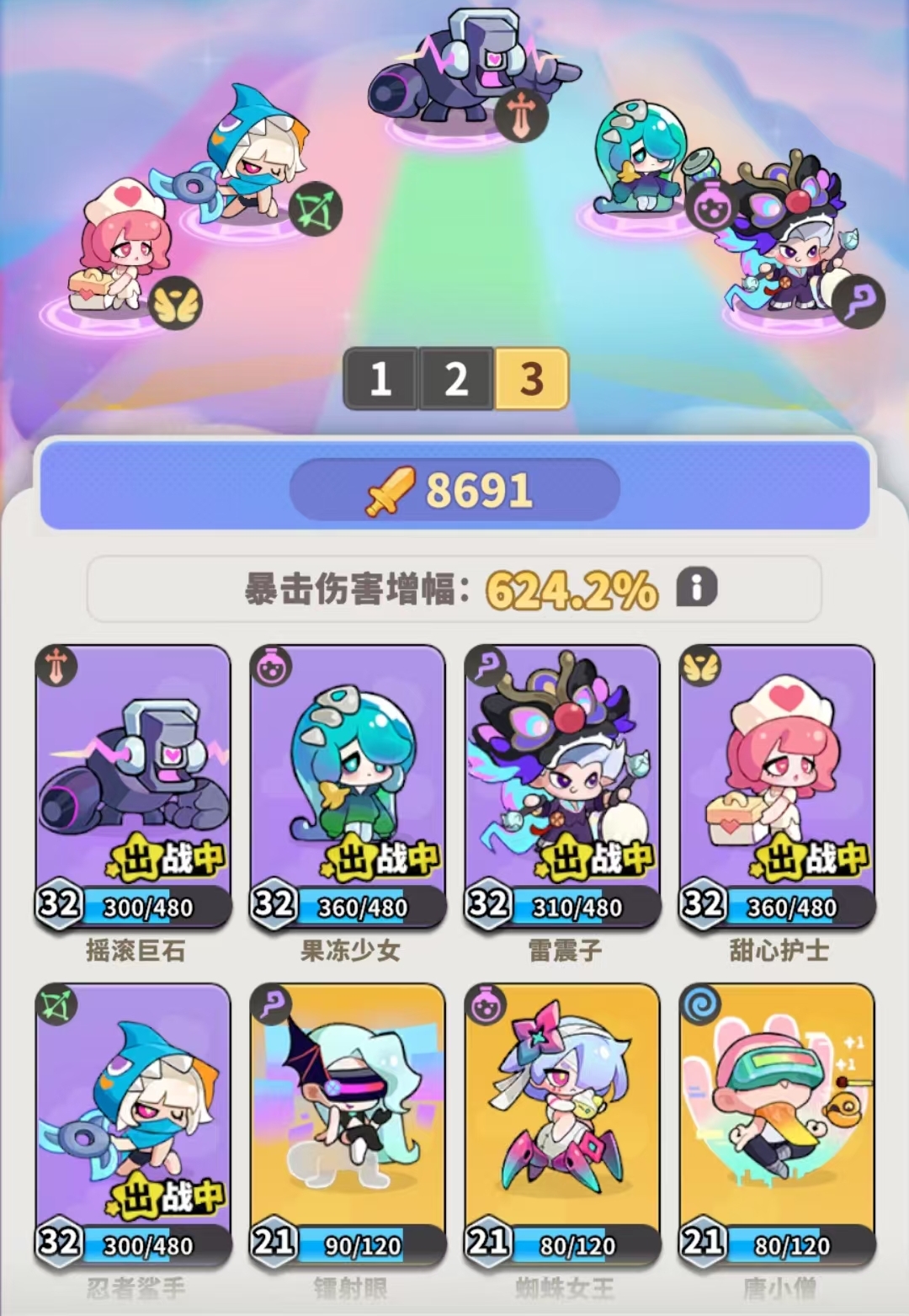 全紫卡阵容主打资源友好与泛用性强。雷震子与忍者鲨手为双主C结构,前者擅长范围雷击,后者专注高频突刺输出;甜心护士保障团队续航;摇滚巨石作为唯一前排稳固防线;果冻少女除提供毒伤补充外,在特定毒系增益关卡中可转为主力输出位。该阵容所有角色碎片获取途径广泛,升级所需材料投入较低,满星后整体战力足以平稳应对第10至20关全部挑战。