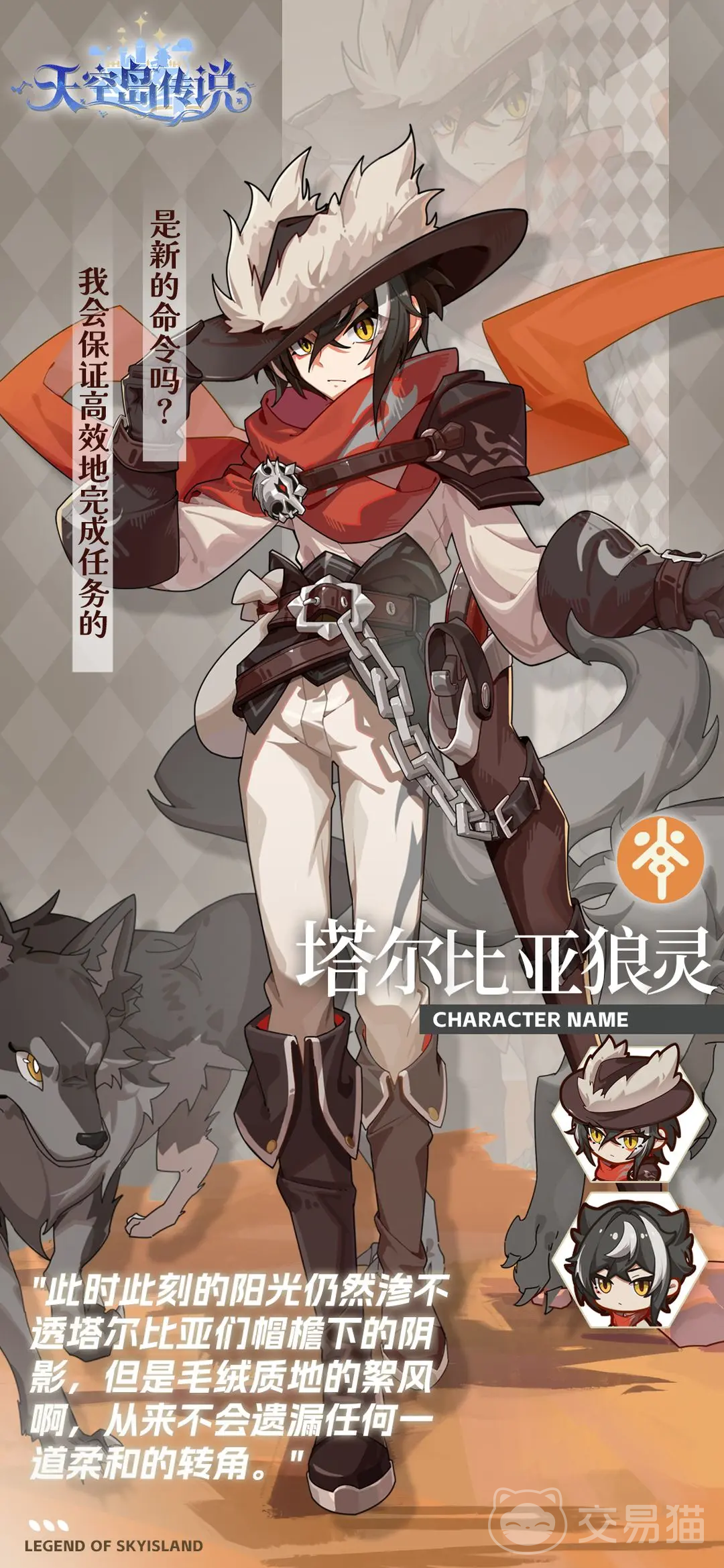栗栗鼠——以松鼠为原型设计的亲和力型精灵,立绘突出圆润线条与憨厚神态,动作姿态自然生动,契合其擅长采集松果的核心技能定位。塔尔比亚狼灵——取材自灰狼的高辨识度战斗系精灵,人形设定融合西部元素:黑白挑染短发、牛仔帽及工装风服饰组合,既保留野性张力,又增添地域文化质感。