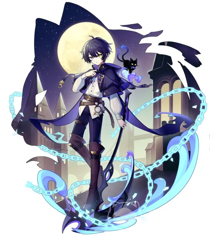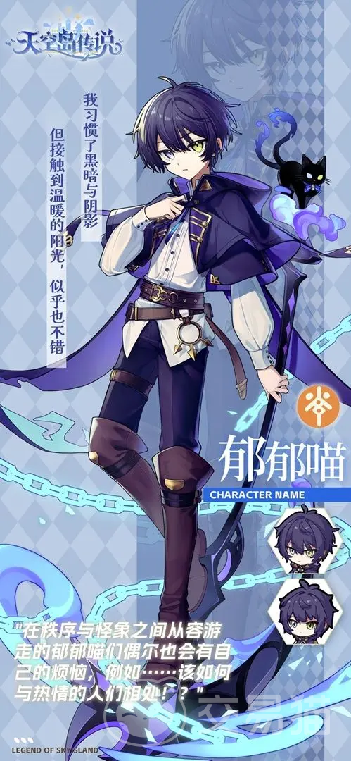 郁郁猫——以蓝调系冷峻风格登场的人形精灵,短发利落,神情沉静,手持大型镰刀造型道具,整体气质兼具锋锐感与神秘感。立绘中伴随的小黑猫为其本体原型,异色瞳、蓝色尾尖与蝴蝶结配饰细节,强化了其灵动而不失个性的角色辨识度。