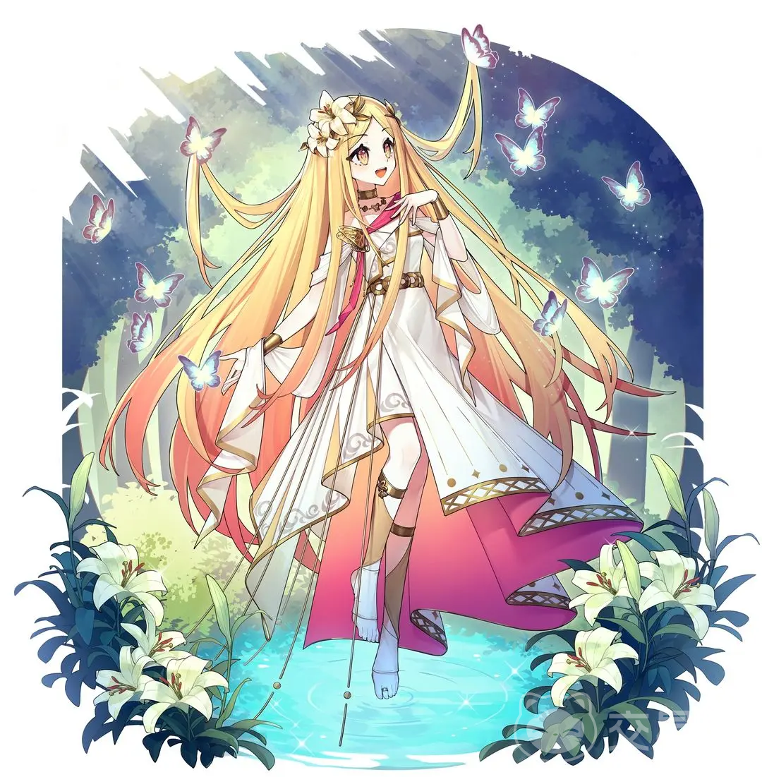 彩蝶歌者——源自蝴蝶形态的治愈系精灵,人形状态下呈现柔和甜美的视觉基调:垂落的明黄色长发、香槟色调的大眼设计,以及头顶佩戴的黄色百合装饰,共同营造出晨曦微光中的精灵公主意象。设定中强调其与破晓时分歌声的关联性,赋予角色诗意化的叙事逻辑。