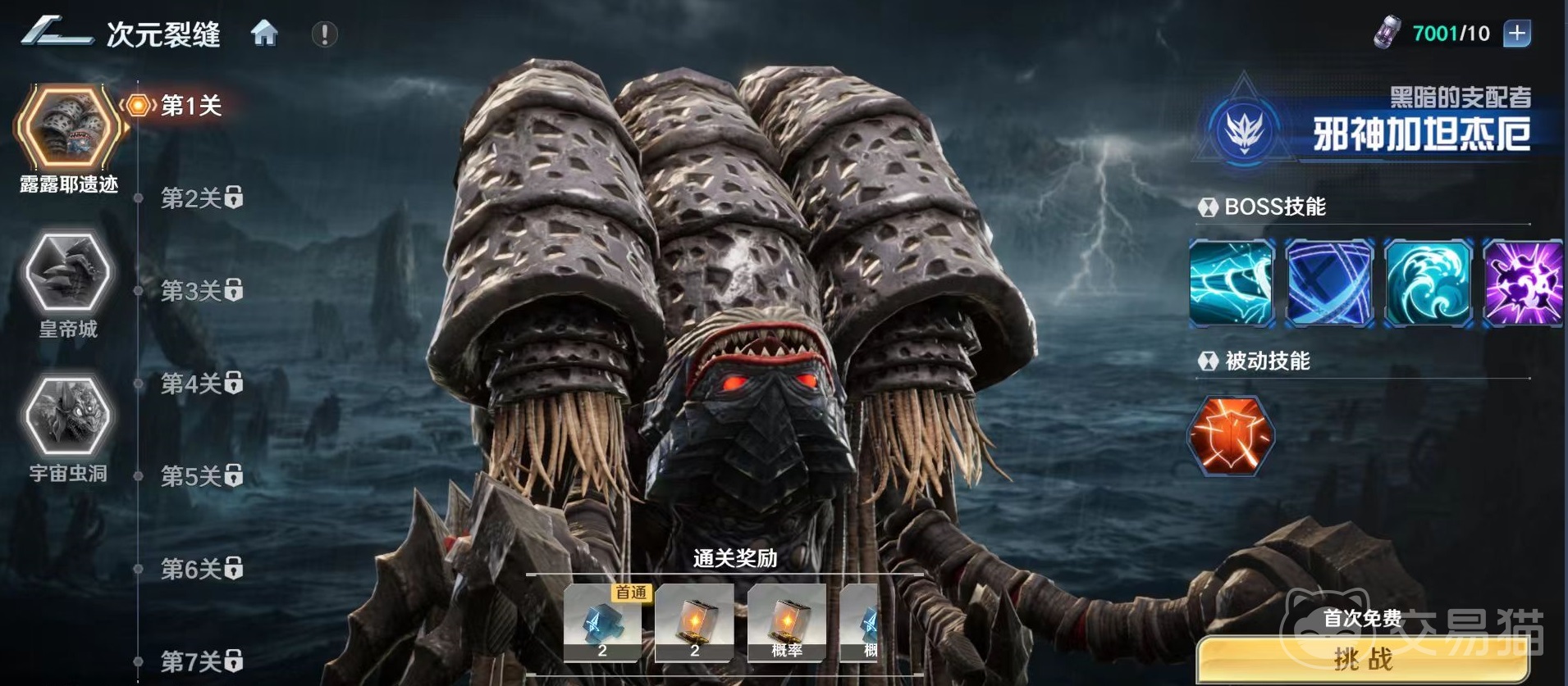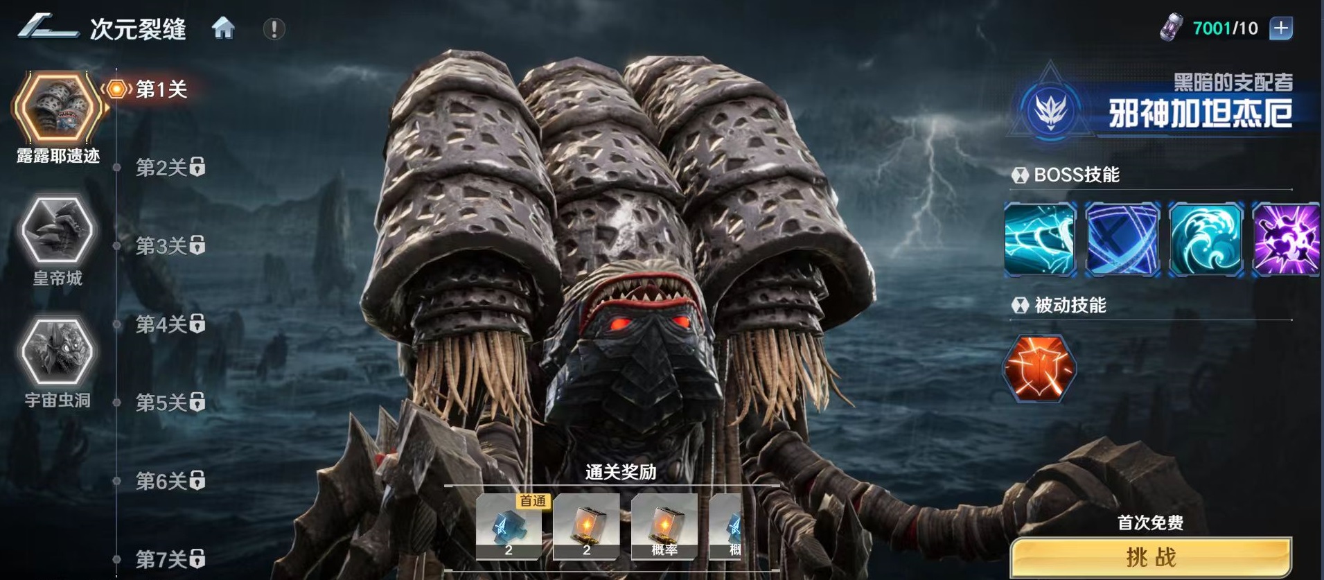 参与次元裂缝需角色等级达到25级。活动入口位于主界面“宇宙港”,点击即可进入。当前开放三大主题副本:露露耶遗迹、皇帝城、宇宙虫洞。三者背景设定各异,对应BOSS拥有独立技能体系与阶段机制,玩家可自由选择任一副本发起挑战。成功击败各副本内指定BOSS后,将稳定获取角色潜力值、突破材料等关键养成资源。