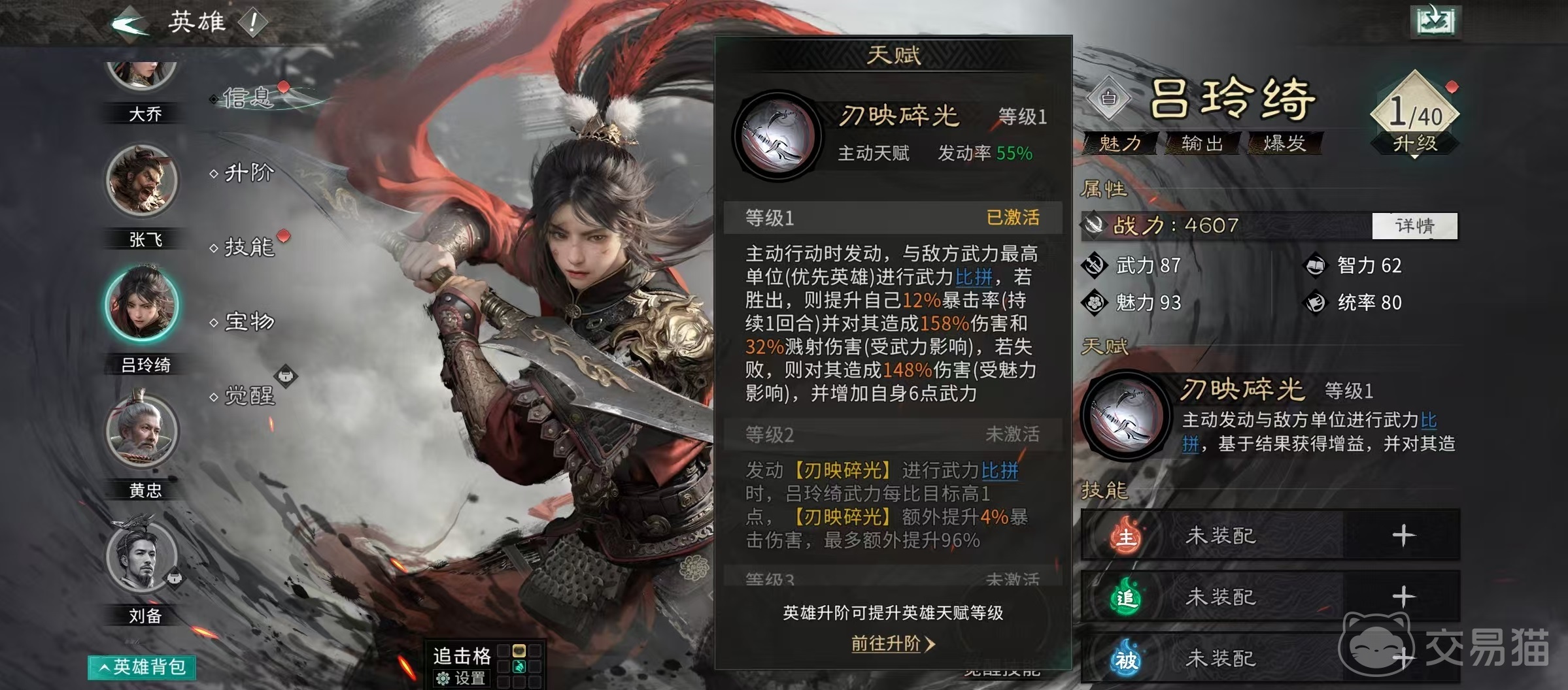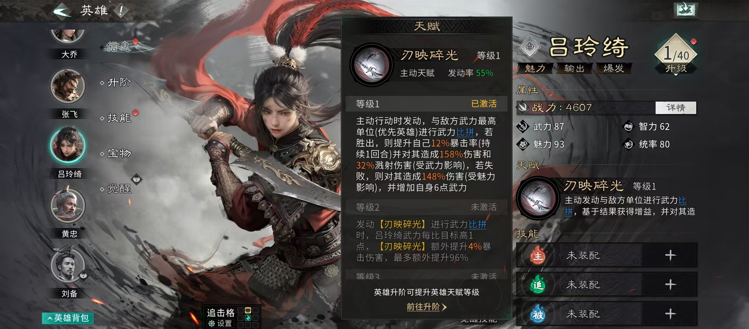 理解吕玲绮的战斗逻辑,需从其天赋机制切入:每当她主动行动时,将自动与敌方当前武力值最高的单位发起比拼。若胜出,可提升自身12%暴击率,并对目标造成伤害及溅射伤害;若失败,则仍可对目标造成基础伤害,并额外获得6点武力值加成。该设计确保其每回合均有稳定输出,并通过失败反馈强化后续行动能力。值得注意的是,其初始武力属性并不突出,因此面对高武力对手时胜率偏低;但对阵智力型武将时,凭借机制优势更容易达成比拼胜利,从而触发暴击增益链式反应。
