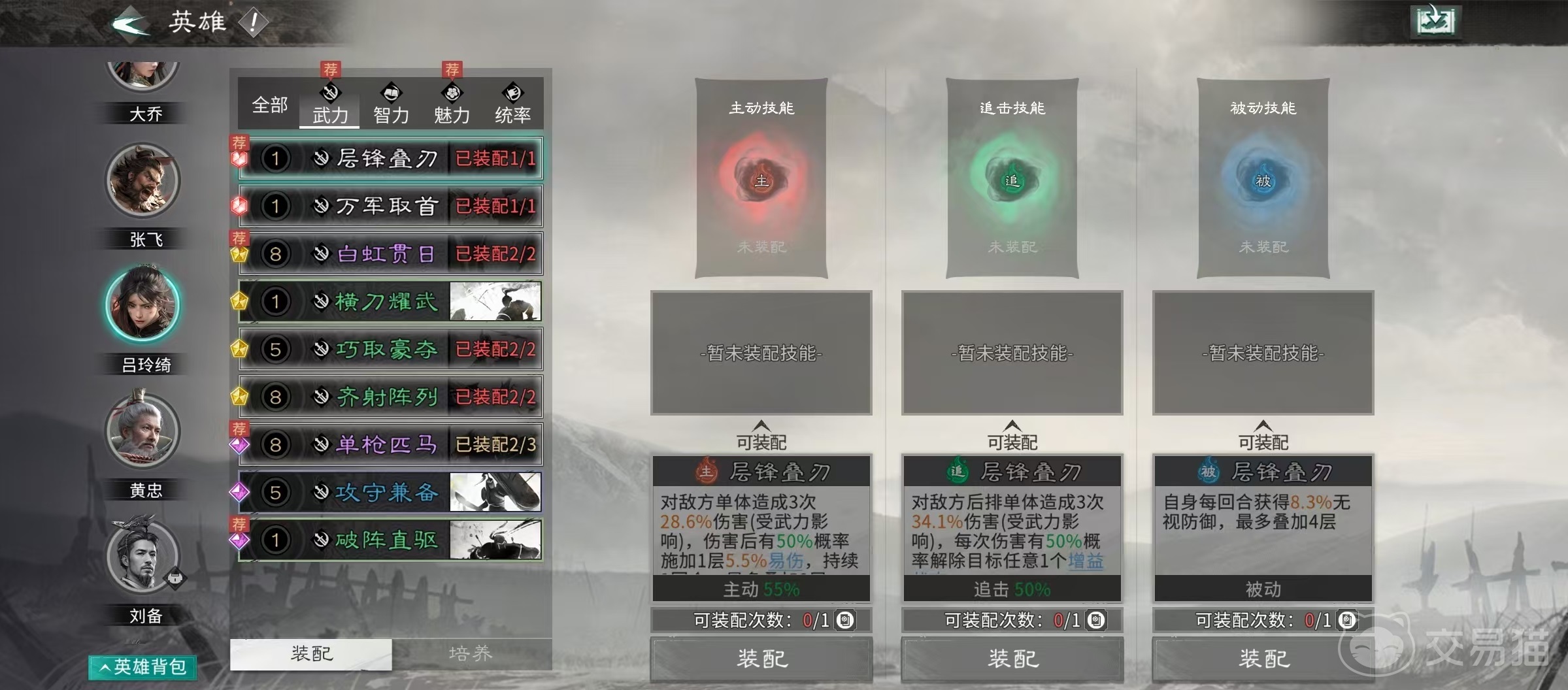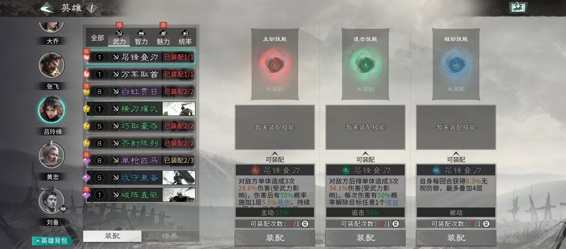 在技能配置上,应紧扣其“魅力型”武将本质,形成双路径发展思路:一是强化魅力属性,推荐携带“两面三刀”或“反间计”,利用策略干扰扩大输出窗口;二是补强武力维度,可选用“层峰叠阵”“白虹贯日”或“单枪匹马”,提升单体压制力与连击稳定性。两类路线均能有效放大其比拼机制带来的收益,具体选择需结合队伍整体定位与资源分配节奏。
