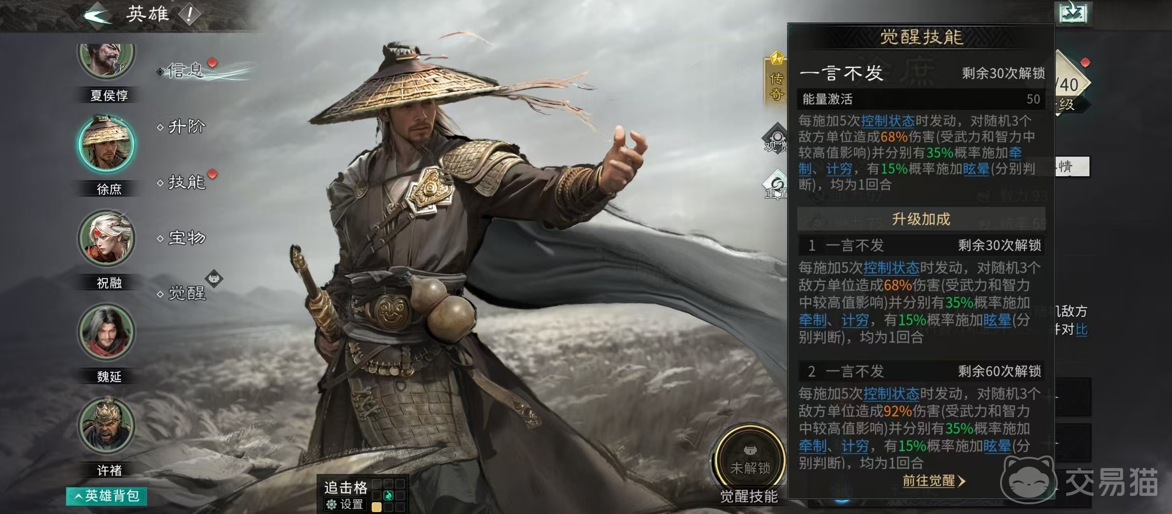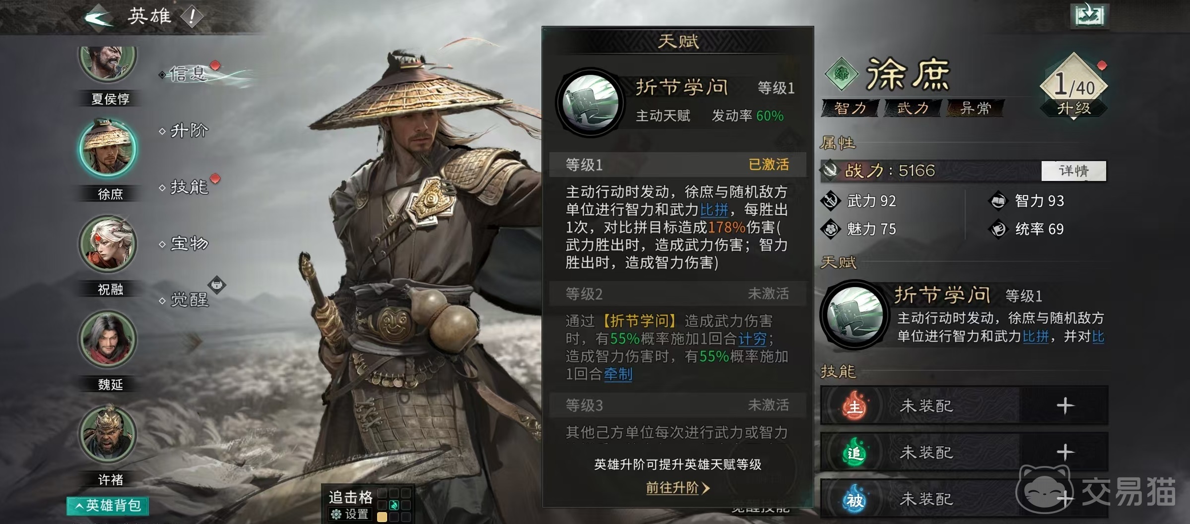 在《三国天下归心》中,徐庶常被玩家低估,但其机制设计极具策略深度——他并非传统意义上的高爆发输出将,而是围绕“比拼”构建核心战斗逻辑的智力型武将。尽管智力属性未达全服顶尖,却稳居中上梯队;更关键的是,其初始武力与智力双项数值均高于同阶多数智力将,为后续多轮比拼提供了坚实基础。