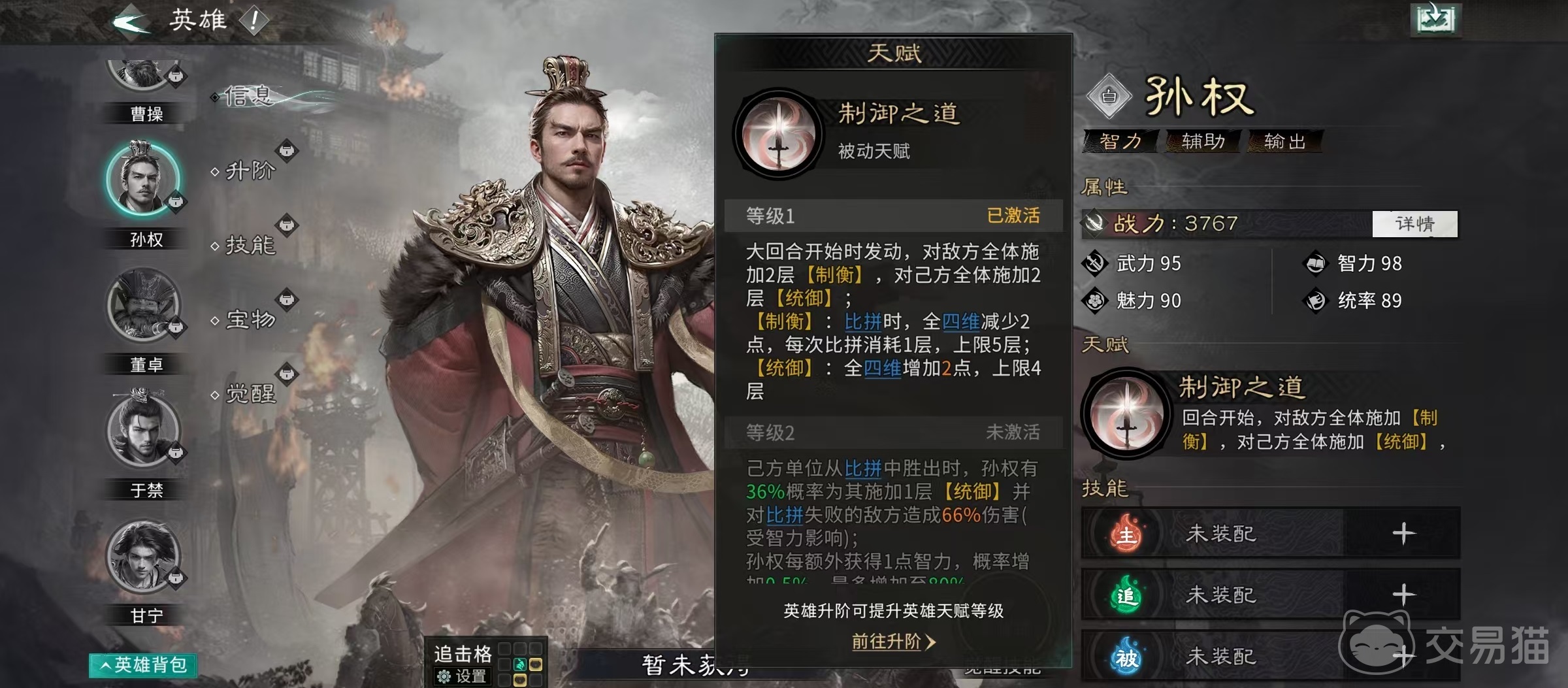 阵容构建上,孙权是徐庶最契合的协同核心。其天赋可对全体敌方施加“制衡”(降低目标四维属性),同时为全体己方赋予“统御”(提升己方四维属性)。双重增益直接抬高徐庶及队友的比拼胜率;且孙权在己方比拼成功时有概率追加统御,在失败时亦能反制敌方,极大稳定徐庶的机制运转环境。在此基础上,徐庶的技能配置可依战术侧重二选一:主武力路线推荐“单枪匹马”,主智力路线则适配“兵不厌诈”或“手到擒来”。